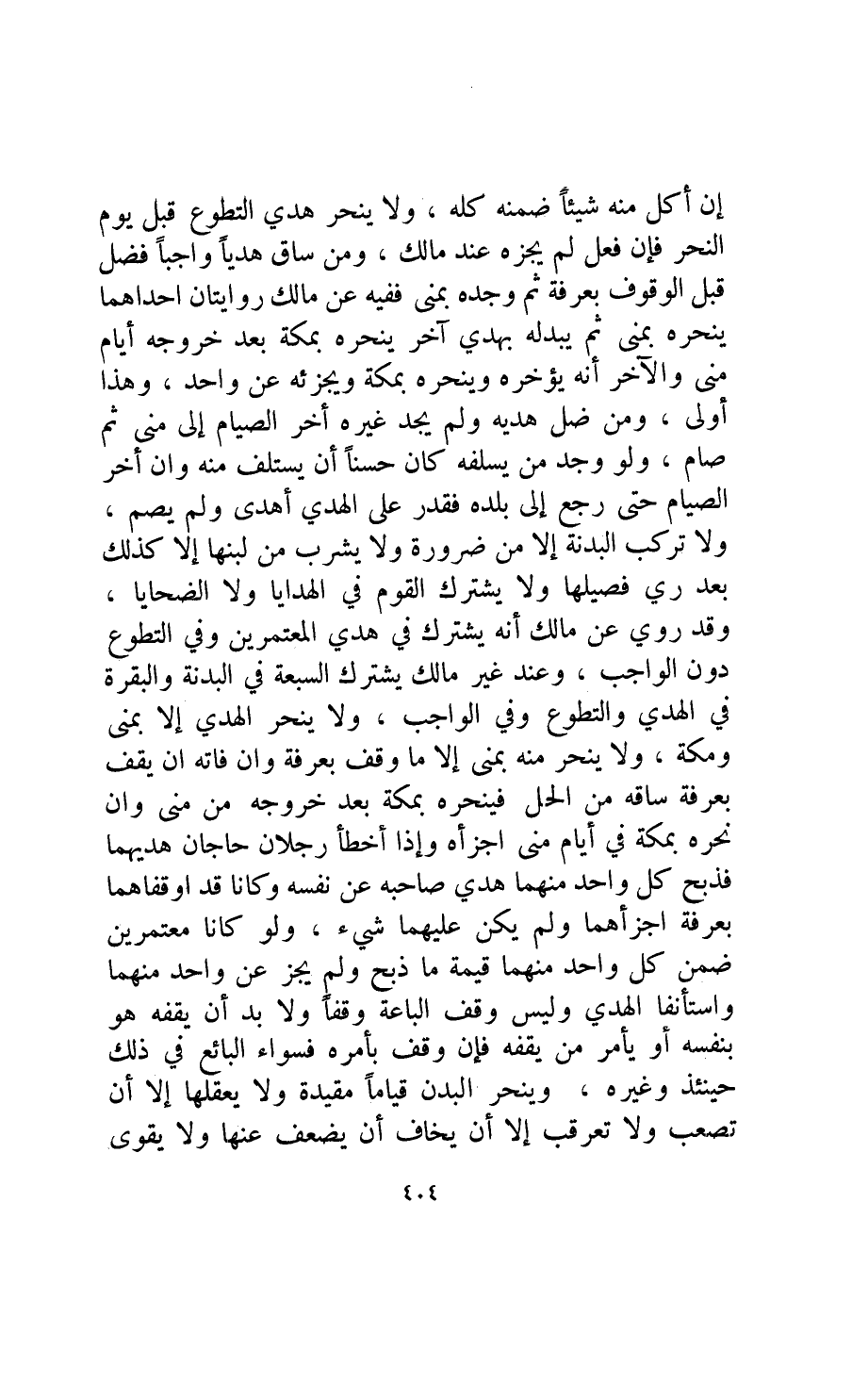 إن أكل منه شيئا ضمنه كله ولا ينحر هدي التطوع قبل يوم النحر فإن فعل لم يجزه عند مالك ومن ساق هديا واجبا فضل قبل الوقوف بعرفة ثم وجده بمنى ففيه عن مالك روايتان احداهما ينحره بمنى ثم يبدله بهدي آخر ينحره بمكة بعد خروجه أيام منى والآخر أنه يؤخره وينحره بمكة ويجزئه عن واحد وهذا أولى ومن ضل هديه ولم يجد غيره أخر الصيام إلى منى ثم صام ولو وجد من يسلفه كان حسنا أن يستلف منه وأن أخر الصيام حتى رجع إلى بلده فقدر على الهدي أهدى ولم يصم ولا تركب البدنة إلا من ضرورة وولا يشرب من لبنها إلا كذلك بعد ري فصيلها ولا يشترك القوم في الهدايا ولا الضحايا وقد روي عن مالك أنه يشترك في هدي المعتمرين وفي التطوع دون الواجب وعند غير مالك يشترك السبعة في البدنة والبقرة في الهدي والتطوع وفي الواجب ولا ينحر الهدي إلا بمنى ومكة ولا ينحر منه بمنى إلا ما وقف بعرفة وإن فاته أن يقف بعرفة ساقه من الحل فينحره بمكة بعد خروجه من منى وأن نحره بمكة في أيام منى اجزأه وإذا أخطأ رجلان حاجان هديهما فذبح كل واحد منهما هدي صحابه عن نفسه وكانا قد أوقفاهما بعرفة اجزأهما ولم يكن عليهما شيء ولو كانا معتمرين ضمن كل واحد منهما قيمة ما ذبح ولم يجز عن واحد منهما واستأنفا الهدي وليس وقف الباعة وقفا ولا بد أن يقفه هو بنفسه أو يأمر من يقفه فإن وقف بأمره فسواء البائع في ذلك حينئذ وغيره وينحر البدن قياما مقيدة ولا يعقلها إلا أن تصعب ولا تعرقب إلا أن يخاف أن يضعف عنها ولا يقوى