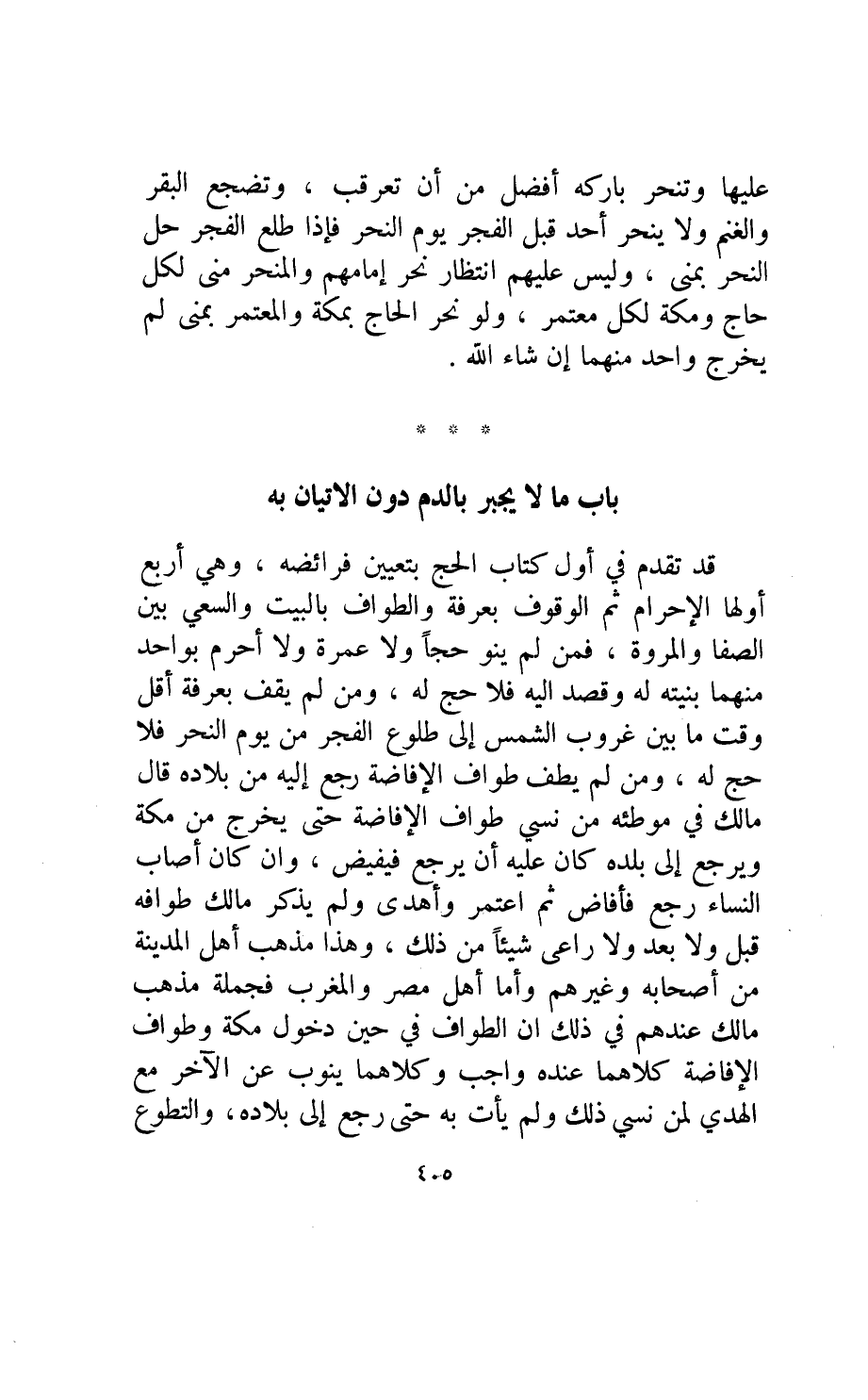 قد تقدم في أول كتاب الحج بتعيين فرائضه وهي أربع أولها الإحرام ثم الوقوف بعرفة والطواف بالبيت والسعي بين الصفا والمروة فمن لم ينو حجا ولا عمرة ولا أحرم بواحد منهما بنيته له وقصد إليه فلا حج له ومن لم يقف بعرفة أقل وقت ما بين غروب الشمس إلى طلوع الفجر من يوم النحر فلا حج له ومن لم يطف طواف الإفاضة رجع إليه من بلاده قال مالك في موطئه من نسي طواف الإفاضة حتى يخرج من مكة ويرجع إلى بلده كان عليه أن يرجع فيفيض وإن كان أصاب النساء رجع فأفاض ثم اعتمر وأهدى ولم يذكر مالك طوافه قبل ولا بعد ولا راعى شيئا من ذلك وهذا مذهب أهل المدينة من أصحابه وغيرهم.