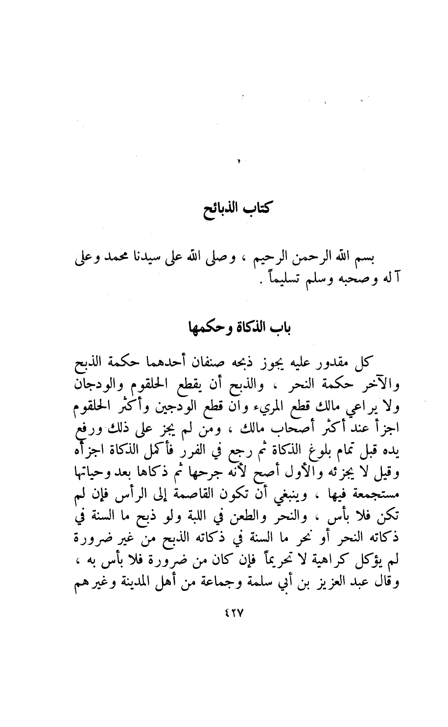 وينبغي أن تكون القلصمة إلى الرأس فإن لم تكن فلا بأس والنحر والطعن في اللبة ولو ذبح ما السنة في ذكاته النحر أو نحر ما السنة في ذكاته الذبح من غير ضرورة لم يؤكل كراهية لا تحريما فإن كان من ضرورة فلا بأس به وقال عبد العزيز بن أبي سلمة وجماعة من أهل المدينة وغيرهم