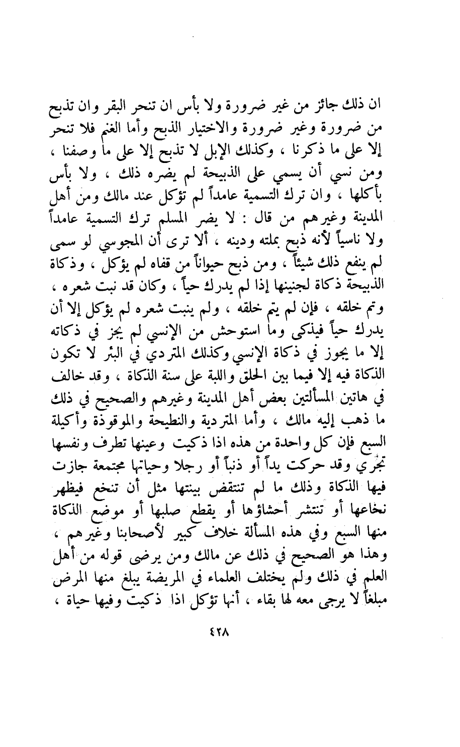 وأما المتردية والنطيحة والموقودة وأكيلة السبع فإن كل واحدة من هذه إذا ذكيت وعينها تطرف ونفسها تجري وقد حركت يدا أو ذنبا أو رجلا وحياتها مجتمعة جازت فيه الذكاة وذلك ما لم تنتقض بينتها مثل أن تنخع فيظهر نخاعها أو تنتشر أحشاؤها أو يقطع صلبها أو موضع الذكاة منها السبع وفي هذه المسألة خلاف كبير لأصحابنا وغيرهم، وهذا هو الصحيح في ذلك عن مالك ومن يرضى قوله من أهل العلم في ذلك ولم يختلف العلماء في المريضة يبلغ منها المرض مبلغا لا يرجى معه لها بقاء أنها تؤكل إذا ذكيت وفيها حياة،