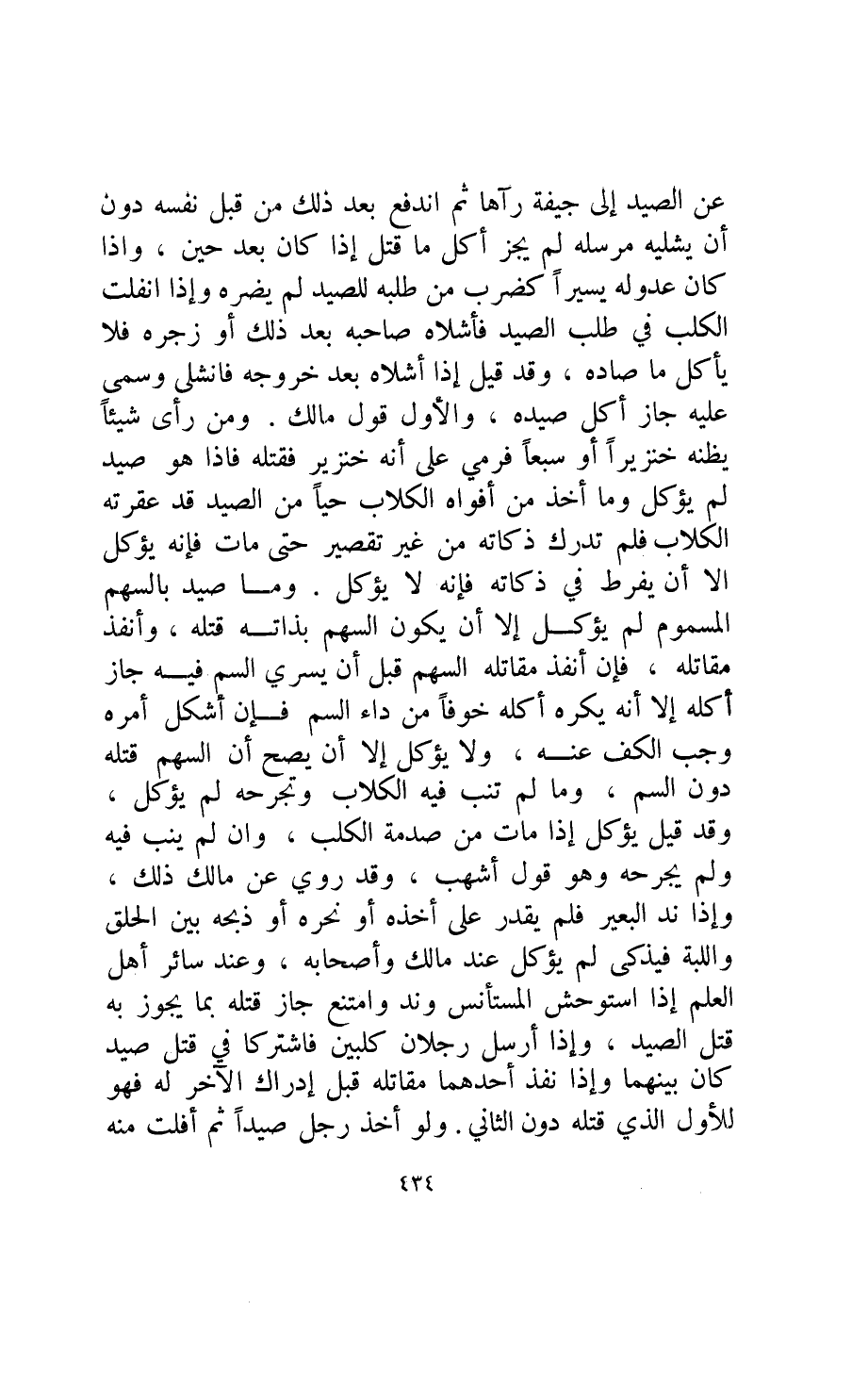 وقد قيل: إذا أشلاه بعد حروجه فانشلى وسمى عليه جاز أكل صيده والأول قول مالك ومن رأى شيئا يظنه خنزيرا أو سبعا فرمي على أنه خنزير فقتله فإذا هو صيد لم يؤكل ومن أخذ من أفواه الكلاب حيا من الصيد قد عقرته الكلاب فلم تدرك ذكاته من غير تقصير حتى مات فإنه يؤكل إلا أن يفرط في ذكاته فإنه لا يؤكل وما صيد بالسهم المسموم لم يؤكل إلا أن يكون السهم بذاته قتله وأنفذ مقاتله فإن أنفذ مقاتله السهم قبل أن يسري السم فيه جاز أكله إلا أنه يكره أكله خوفا من داء السم فإن أشكل أمره وجب الكف عنه ولا يؤكل إلا أن يصح أن السهم قتله دون السم وما لم تنب فيه الكلاب وتجرحه لم يؤكل وقد قيل يؤكل إذا مات من صدمة الكلب وإن لم ينب فيه ولم يجرحه وهو قول أشهب.