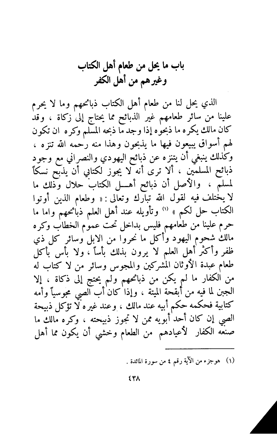 الذي يحل لنا من طعام أهل الكتاب ذبائحهم وما لا يحرم علينا من سائر طعامهم غير الذبائح مما يحتاج إلى زكاة وقد كان مالك يكره ما ذبحوه إذا وجد ما ذبحه المسلم وكره أن تكون لهم أسواق يبيعون فيها ما يذبحون وهذا منه رحمه الله تنزه وكذلك ينبغي أن يتنزه عن ذبائح اليهودي والنصراني مع وجود ذبائح المسلمين ألا ترى أنه لا يجوز لكتابي أن يذبح نسكا لمسلم والأصل أن ذبائح أهل الكتاب حلال وذلك ما لا يختلف فيه لقول الله تبارك وتعالى: {وَطَعَامُ الَّذِينَ أُوتُوا الْكِتَابَ حِلٌّ لَكُمْ} وتأويله عند أهل العلم ذبائحهم.