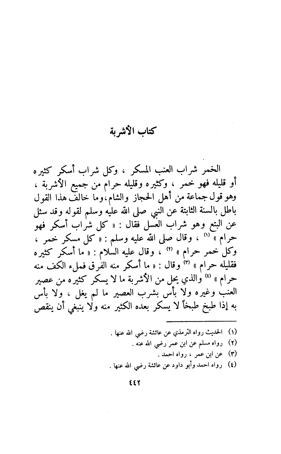 الخمر شراب العنب المسكر وكل شراب أسكر كثيره أو قليله فهو خمر وكثيره وقليله حرام من جميع الأشربة وهو قول جماعة من أهل الحجاز والشام وما خالف هذا القول باطل بالسنة الثابتة عن النبي صلى الله عليه وسلم لقوله وقد سئل عن البتع وهو شراب العسل فقال: "كل شراب أسكر فهو حرام" وقال صلى الله عليه وسلم: "كل مسكر خمر وكل خمر حرام" وقال عليه السلام: "ما أسكر كثيره فقليله حرام" وقال: "ما أسكر منه الفرق فملء الكف منه حرام".