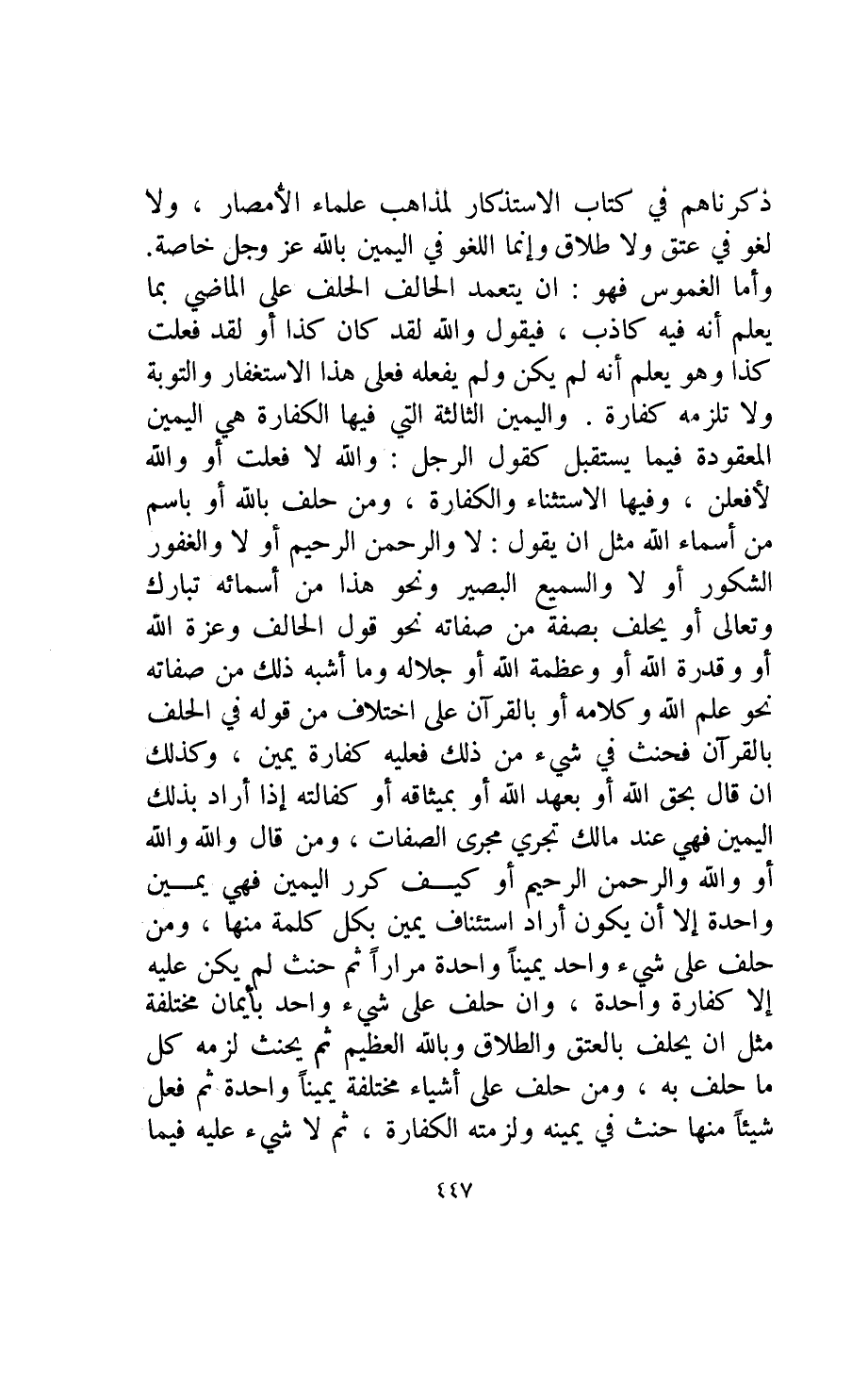 واليمين الثالثة: التي فيها الكفارة هي اليمين المعقودة فيما يستقبل كقول الرجل: والله لا فعلت أو والله لأفعلن وفيها الاستثناء والكفارة ومن حلف بالله أو باسم من أسماء الله مثل أن يقول: لا والرحمن الرحيم أو لا والغفور الشكور أو لا والسميع البصير ونحو هذا من أسمائه تبارك وتعالى أو يحلف بصفة من صفاته، نحو قول الحالف: وعزة الله أو قدرة الله أو وعظمة الله أو جلاله وما أشبه نذلك من صفاته، نحو: علم الله وكلامه أو بالقرآن عل اختلاف من قوله في الحلف بالقرآن فحنث في شيء من ذلك فعليه كفارة يمين.