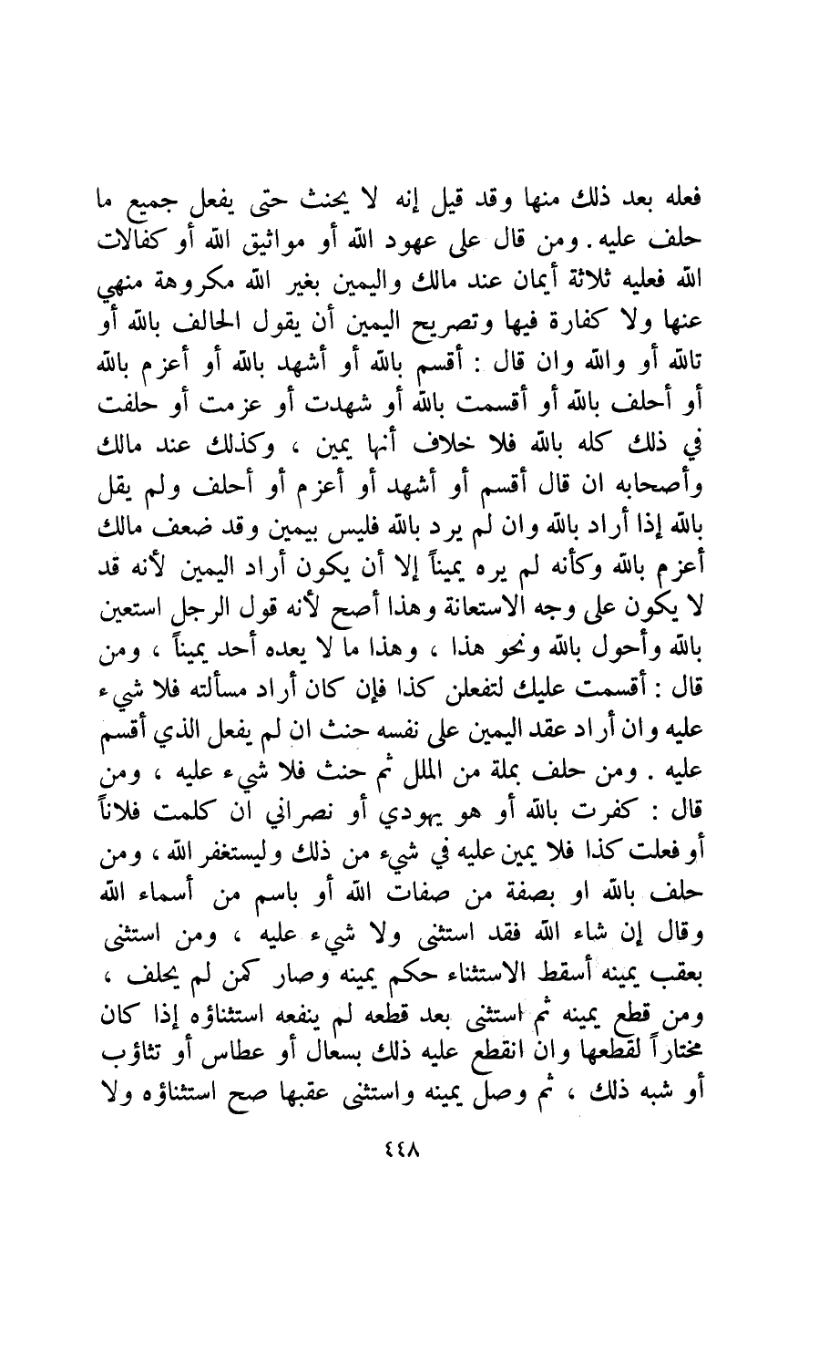 ومن حلف بملة من الملل ثم حنث فلا شيء عليه ومن قال: كفرت بالله أو هو يهودي أو نصراني إن كلمت فلانا أو فعلت كذا فلا يمين عليه في شيء من ذلك وليستغفر الله ومن حلف بالله أو بصفة من صفات الله أو باسم من أسماء الله وقال: إن شاء الله فقد استثنى ولا شيء عليه ومن استثنى بعقب يمينه أسقط الاستثناء حكم يمينه وصار كمن لم يحلف ومن قطع يمينه ثم استثنى بعد قطعه لم ينفعه استثناؤه إذا كان مختارا لقطعها وان انقطع عليه ذلك بسعال أو عطاس أو تثاؤب أو شبه ذلك ثم وصل يمينه واستثنى عقبها صح استثناؤه ولا
