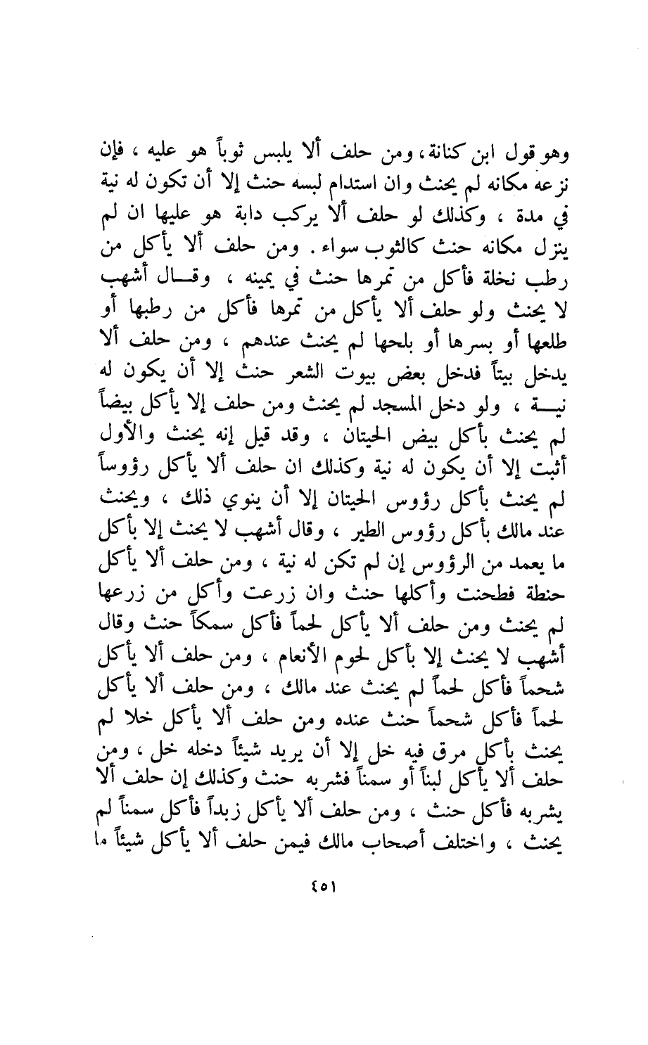 وقال أشهب: لا يحنث إلا بأكل ما يعمد من الرؤوس إن لم تكن له نية ومن حلف ألا يأكل حنطة فطحنت وأكلها حنث وان زرعت وأكل من زرعها لم يحنث ومن حلف ألا يأكل لحما فأكل سمكا حنث.