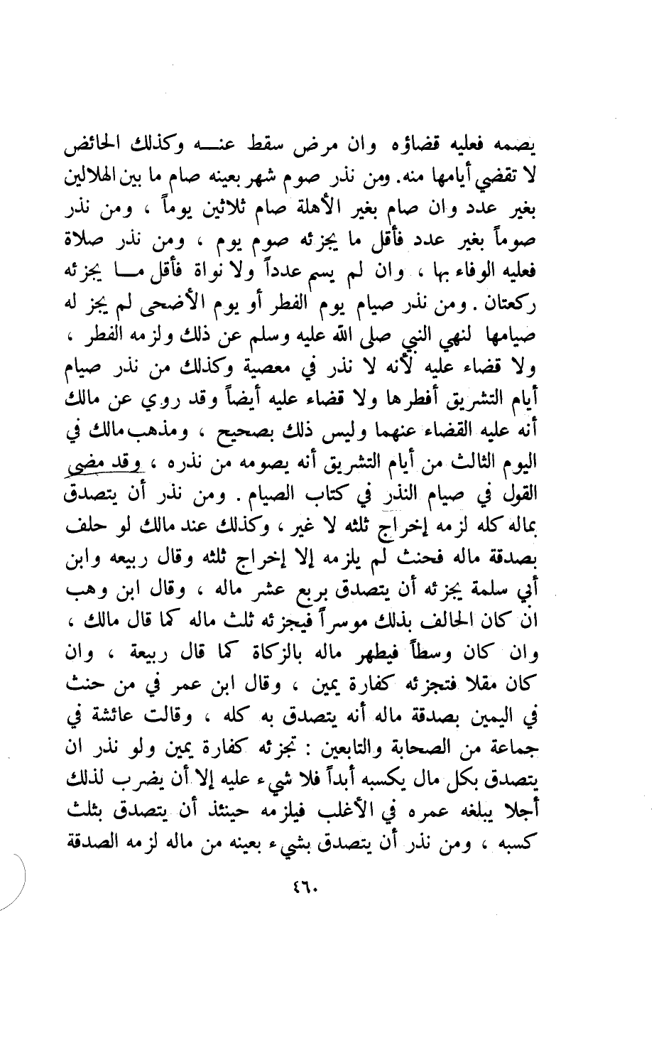 يصمه فعليه قضاؤه وان مرض سقط عنه وكذلك الحائض لا تقضي أيامها منه ومن نذر صوم شهر بعينه صام ما بين الهلالين بغير عدد وان صام بغير الأهلة صام ثلاثين يوما ومن نذر صوما بغير عدد فأقل ما يجزئه صوم يوم ومن نذر صلاة فعليه الوفاء بها وان لم يسم عددا ولا نواة فأقل ما يجزئة ركعتان صوم يوم ومن ومن نذر صيام يوم الفطر أو يوم الأضحى لم يجز له صيامها لنهي النبي صلى الله عليه وسلم عن ذلك ولزمه الفطر ولا قضاء عليه لأنه لا نذر في معصية وكذلك من نذر صيام أيام التشريق أفطرها ولا قضاء عليه أيضا وقد روي عن مالك أنه عليه القضاء عنهما وليس ذلك بصحيح ومذهب مالك في اليوم الثالث من أيام التشريق أنه يصومه من نذره وقد مضى القول في صيام النذر في كتاب الصيام.