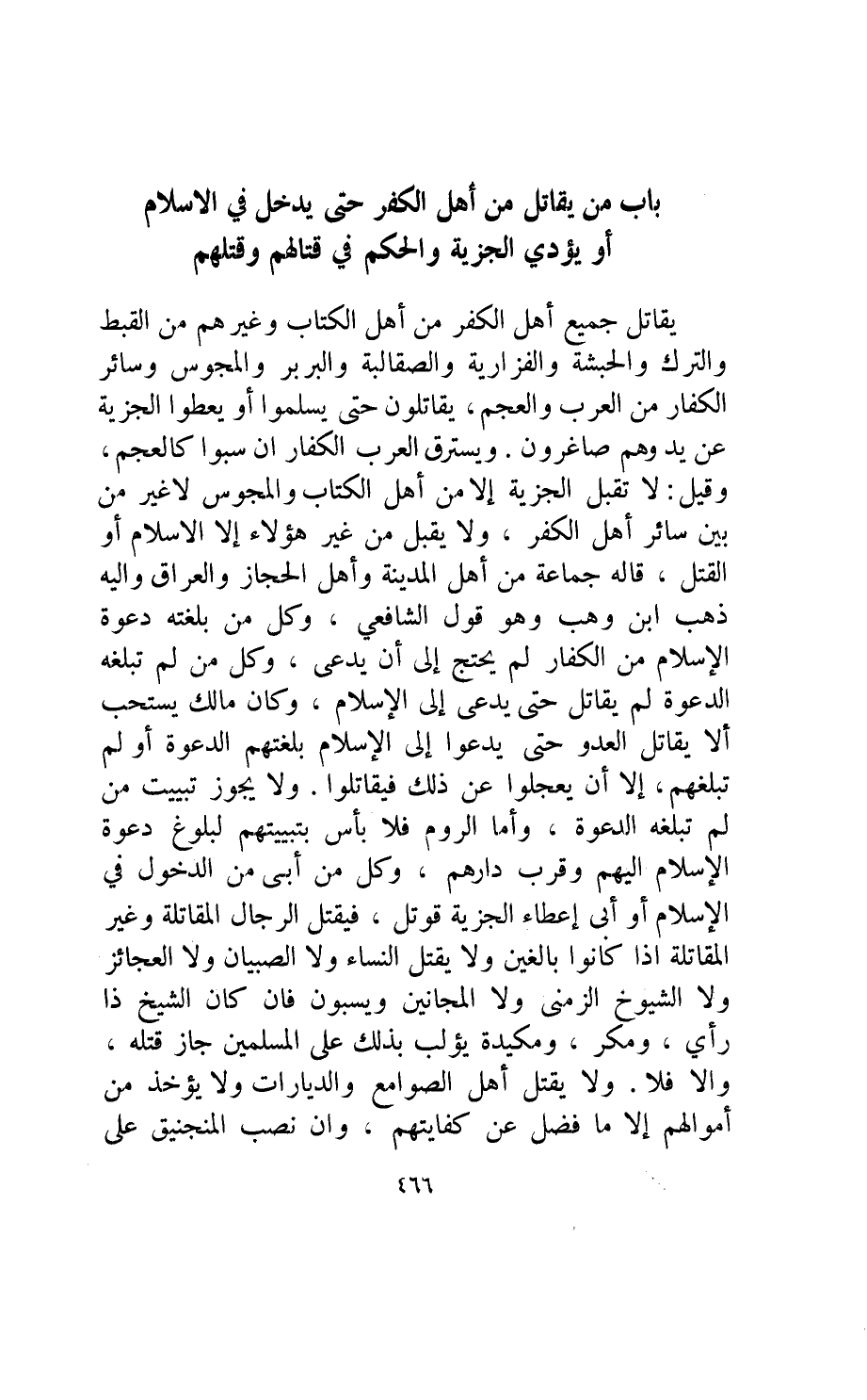 يقاتل جميع أهل الكفر من أهل الكتاب وغيرهم من القبط والبرك والحبشة والفزاريه والصقالبة والبربر والمجوس وسائر الكفار من العرب والعجم يقاتلون حتى يسلموا أويعطوا الجزية عن يد وهم صاغرون.