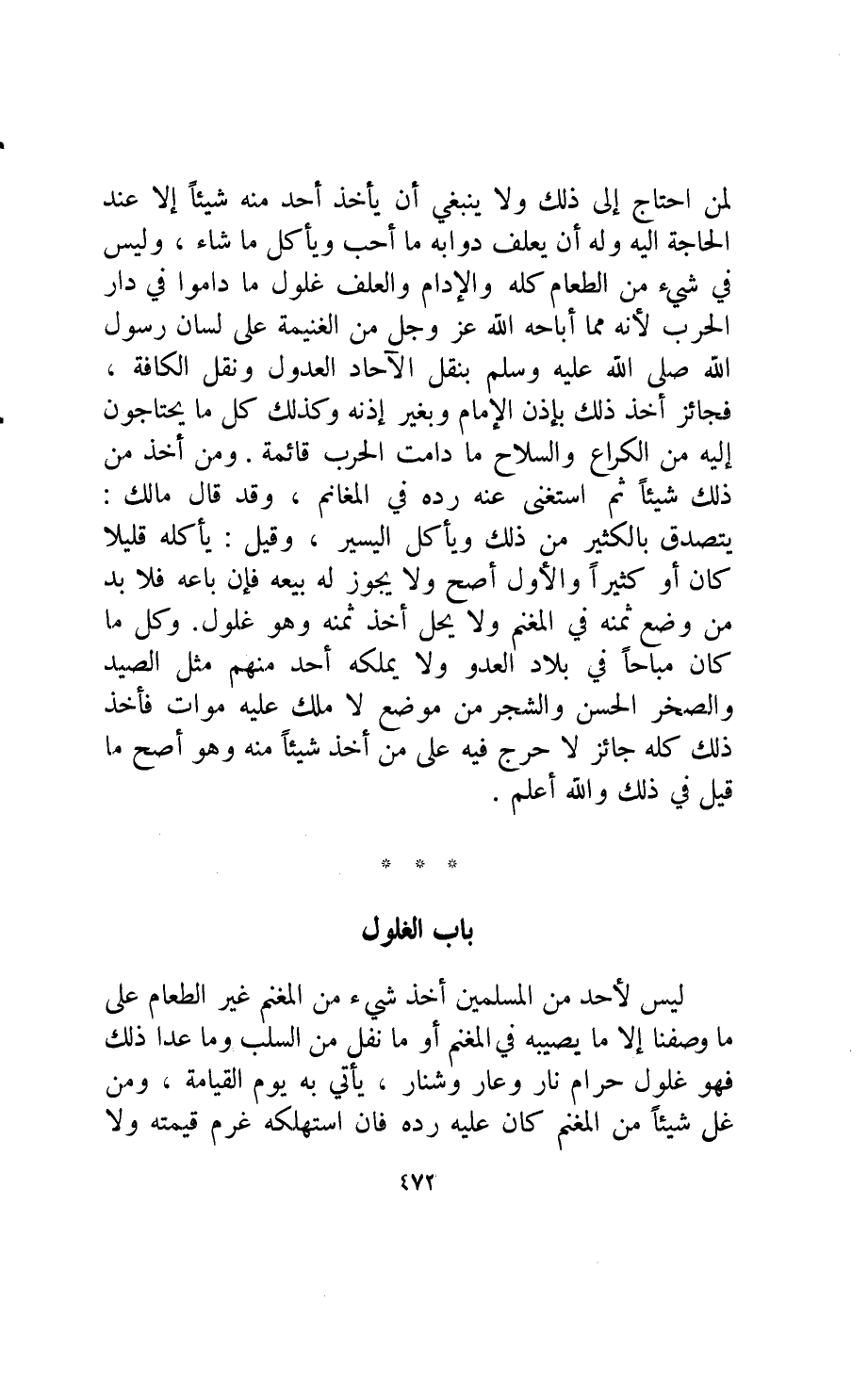ليس لأحد من المسلمين أخذ شيء من المغنم غير الطعام على ما وصفنا إلا ما يصيبه في المغنم أو ما نفل من السلب وما عدا ذلك فهو غلول حرام نار وعار وشنار يأتي به يوم القيامة ومن غل شيئا من المغنم كان عليه رده فإن استهلكه غرم قيمته ولا