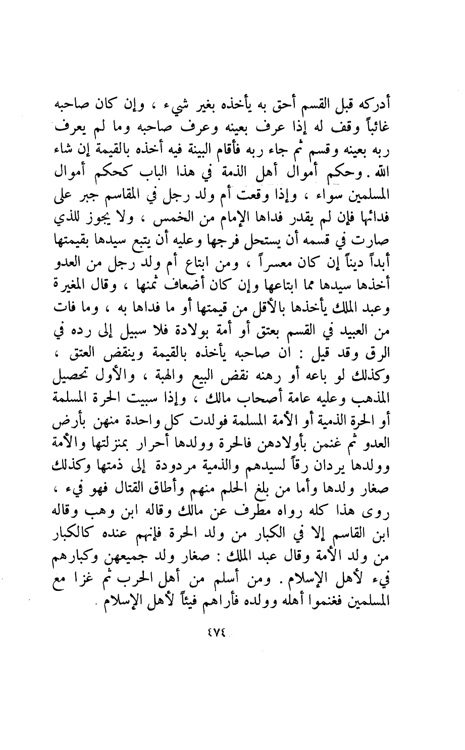 وحكم أموال أهل الذمة في هذا الباب كحكم أموال المسلمين سواء وإذا وقعت أم ولد رجل في المقاسم جبر على فدائها فإن لم يقدر فداها الإمام من الخمس ولا يجوز للذي صارت في قسمه أن يستحل فرجها وعليه أن يتبع سيدها بقيمتها أبدا دينا إن كان معسرا ومن ابتاع أم ولد رجل من العدو أخذها سيدها مما ابتاعها وإن كان أضعاف ثمنها.