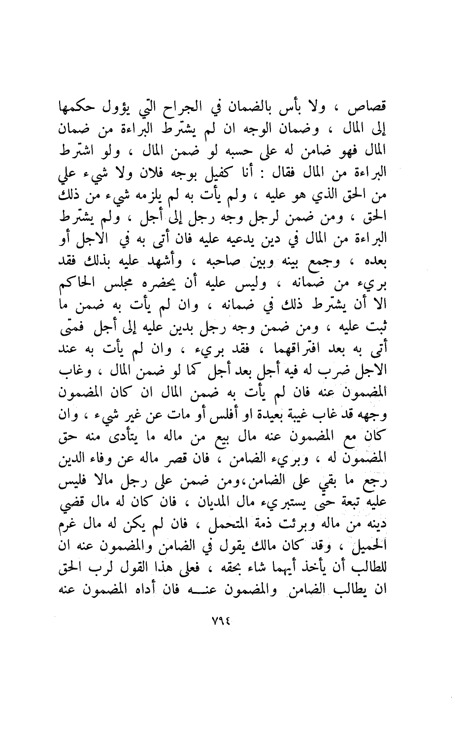 قصاص ولا بأس بالضمان في الجراح التي يؤول حكمها الى المال وضمان الوجه إن لم يشترط البراءة من ضمان المال فهو ضامن له على حسبه لو ضمن المال ولو اشترط البراءة من المال فقال أنا كفيل بوجه فلان ولا شيء علي من الحق الذي هو عليه ولم يأت به لم يلزمه شيء من ذلك الحق ومن ضمن لرجل وجه رجل إلى أجل ولم يشترط البراءة من المال في دين يدعيه عليه فإن اتى به في الأجل أو بعده وجمع بينه وبين صاحبه وأشهد عليه بذلك فقد برئ من ضمانه وليس عليه أن يحضره مجلس الحاكم إلا أن يشترط ذلك في ضمانه وإن لم يأت به ضمن ما ثبت عليه ومن ضمن وجه رجل بدين عليه إلى أجل فمتى أتى به بعد افتراقهما فقد برىء وأن لم يأت به عند الأجل ضرب له فيه أجل بعد أجل كما لو ضمن المال وغاب المضمون عنه فإن لم يأت به ضمن المال إن كان المضمون وجهه قد غاب غيبة بعيدة أو أفلس أو مات عن غير شيء وإن كان مع المضمون عنه مال بيع من ماله ما يتأدى منه حق المضمون له وبرئ الضامن فإن قصر ماله عن وفاء الدين رجع ما بقي على الضامن ومن ضمن على رجل مالا فليس عليه تبعة حتى يستبرئ مال المديان فإن كان له مال قضي دينه من ماله وبرئت ذمة المتحمل فإن لم يكن له مال غرم الحميل وقد كان مالك يقول في الضامن والمضمون عنه أن للطالب أن يأخذ أيهما شاء بحقه فعلى هذا القول لرب الحق أن يطالب الضامن والمضمون عنه فإن أداه المضمون عنه