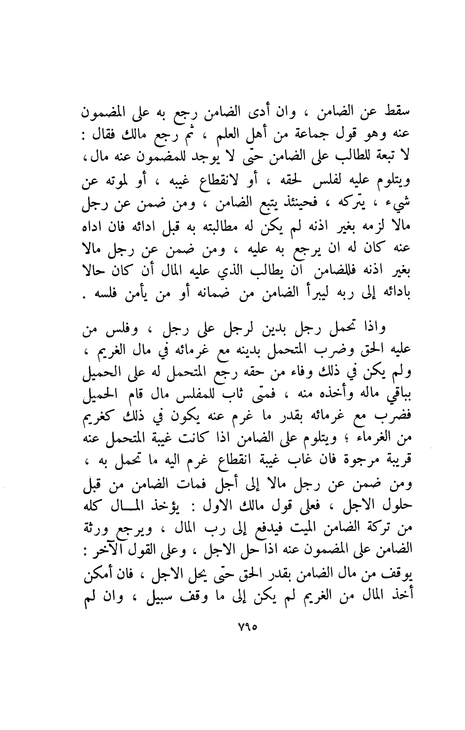 وإذا تحمل رجل يدين لرجل على رجل وفلس من عليه الحق وضرب المتحمل بدينه مع غرمائه في مال الغريم ولم يكن في ذلك وفاء من حقه رجع المتحمل له على الحميل بباقي ماله وأخذه منه فمتى ثاب للمفلس مال قام الحميل فضرب مع غرمائه بقدر ما غرم عنه يكون في ذلك كغريم من الغرماء ويتلوم على الضامن إذا كانت غيبة المتحمل عنه قريبة مرجوة فإن غاب غيبة انقطاع غرم اليه ما تحمل به ومن ضمن عن رجل مالا إلى أجل فمات الضامن من قبل حلول الاجل فعلى قول مالك الاول يؤخذ المال كله من تركة الضامن الميت فيدفع الى رب المال ويرجع ورثة الضامن على المضمون عنه إذا حل الاجل وعلى القول الآخر يوقف من مال الضامن بقدر الحق حتى يحل الاجل فإن أمكن أخذ المال من الغريم لم يكن إلى ما وقف سبيل وإن لم