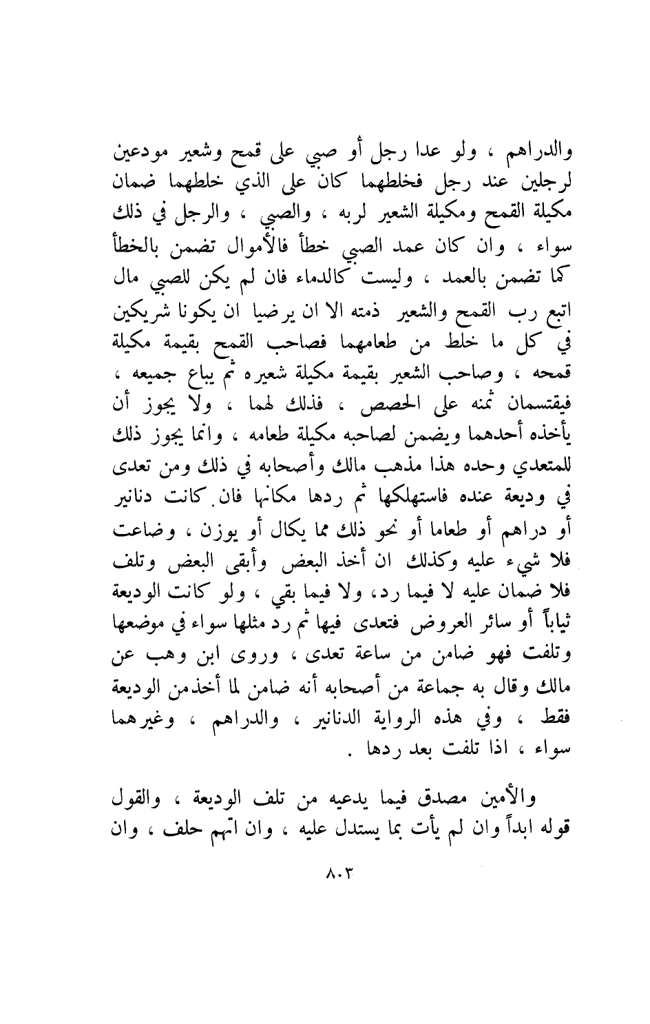 والدراهم ولو عدا رجل او صبي على قمح وشعير مودعين لرجلين عند رجل فخلطهما كان على الذي خلطهما ضمان مكيلة القمح ومكيلة الشعير لربه والصبي والرجل في ذلك سواء وإن كان عمد الصبي خطأ فالأموال تضمن بالخطأ كما تضمن بالعمد وليست كالدماء فإن لم يكن للصبي مال اتبع رب القمح والشعير ذمته الا ان يرضيا أن يكونا شريكين في كل ما خلط من طعامهما فصاحب القمح بقيمة مكيلة قمحه وصاحب الشعير بقيمة مكيلة شعيره ثم يباع جميعه فيقتسمان ثمنه على الحصص فذلك لهما ولا يجوز أن يأخذه أحدهما ويضمن لصاحبه مكيلة طعامه وإنما يجوز ذلك للمعتدي وحده هذا مذهب مالك وأصحابه في ذلك ومن تعدى في وديعة عنده فاستهلكها ثم ردها مكانها فإن كانت دنانير أو دراهم أو طعاما أو نحو ذلك يكون مما يكال أو يوزن وضاعت فلا شيء عليه وكذلك أن اخذ البعض وأبقى البعض وتلف فلا ضمان عليه لا فيما رد ولا فيما بقي ولو كانت الوديعة ثيابا أو سائر العروض فتعدى فيها ثم رد مثلها سواء في موضعها وتلفت فهو ضامن من ساعة تعدى وروى ابن وهب عن مالك وقال به جماعة من اصحابه أنه ضامن لما أخذ من الوديعة فقط وفي هذه الرواية الدنانير والدراهم وغيرهما سواء اذا تلفت بعد ردها
