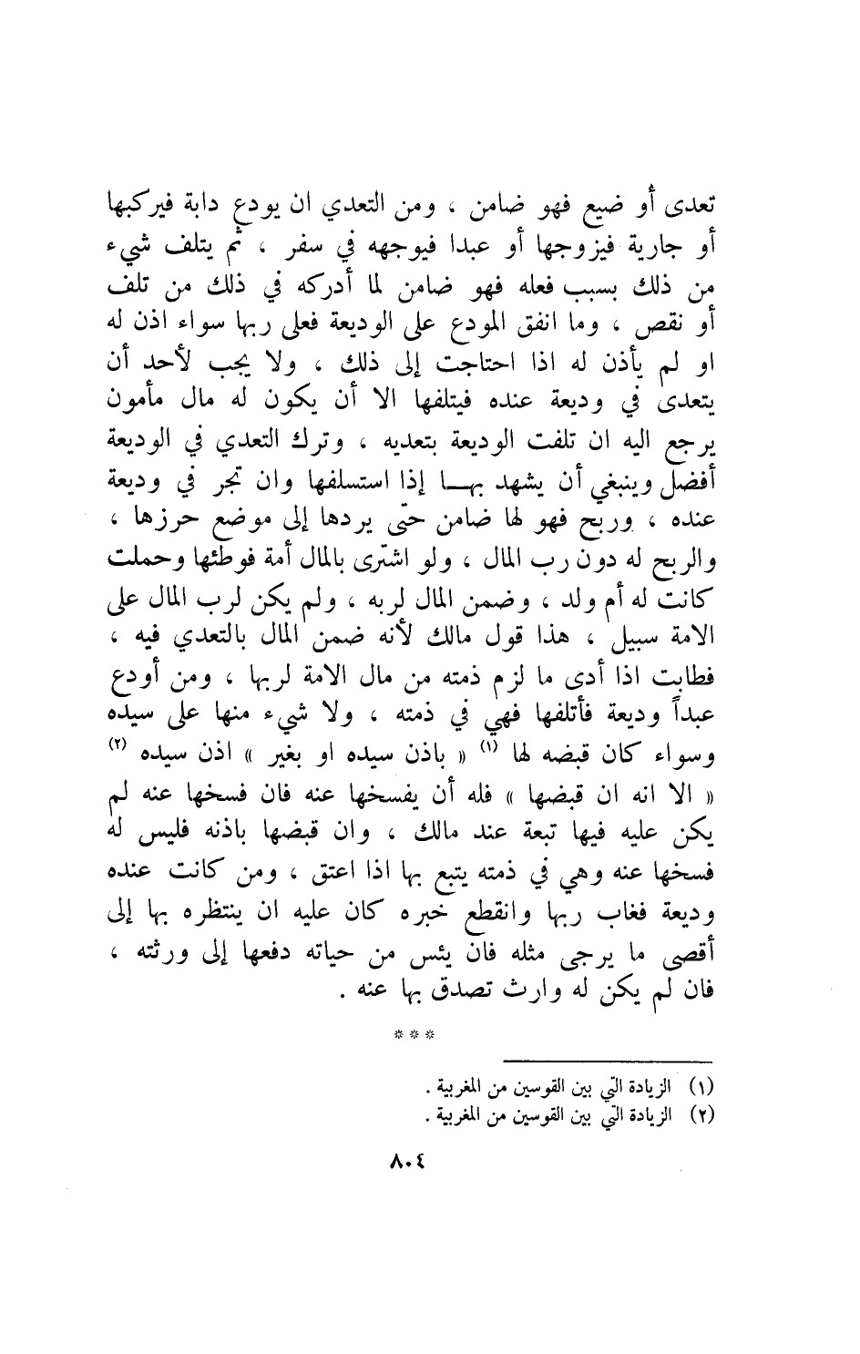 تعدى او ضيع فهو ضامن ومن التعدى أن يودع دابة فيركب أو جارية فيزوجها أو عبدا فيوجهه في سفر ثم يتلف شيء من ذلك بسبب فعله فهو ضامن لما ادركه في ذلك من تلف او نقص وما انفق المودع على الوديعة فعلى ربها سواء اذن له او لم يأذن له اذا احتاجت الى ذلك ولا يجب لأحد أن يتعدى في وديعة عنده فيتلفها إلا ان يكون له مال مأمون يرجع اليه ان تلفت الوديعة بتعديه وترك التعدي في الوديعة أفضل وينبغي أن يشهد بها إذا استسلفها وإن تجر في وديعة عنده وربح فهو لها ضامن حتى يردها الى موضع حرزها والربح له دون رب المال ولو اشترى بالمال أمة فوطئها وحملت كانت له ام ولد وضمن المال لربه ولم يكن لرب المال على الامة سبيل هذا قول مالك لأنه ضمن المال بالتعدي فيه فطابت اذا أدى ما لزم ذمته من مال الامة لربها ومن أودع عبدا وديعة فأتلفها فهي في ذمته ولا شيء منها على سيده وسواء كان قبضه لها بإذن سيده أو بغير إذن سيده الا انه ان قبضها فله أن يفسخها عنه فإن فسخها عنه لم يكن عليه فيها تبعة عند مالك وإن قبضها بإذنه فليس له فسخها عنه وهي في ذمته يتبع بها اذا اعتق ومن كانت عنده وديعة فغاب ربها وانقطع خبره كان عليه ان ينتظره بها الى اقصى ما يرجى مثله فإن يئس من حياته دفعها الى ورثته فإن لم يكن له وارث تصدق بها عنه