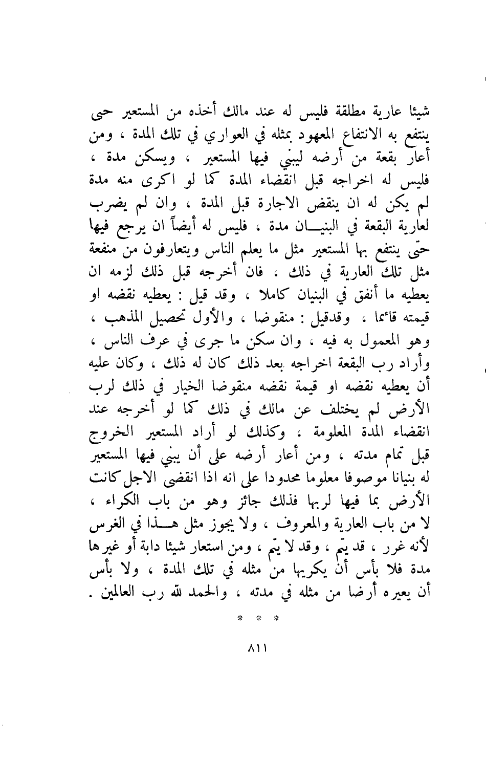 شيئا عارية مطلقة فليس له عند مالك اخذه من المستعير حتى ينتفع به الانتفاع المعهود بمثله في العواري في تلك المدة ومن أعار بقعة من أرضه ليبني فيها المستعير ويسكن مدة فليس له إخراجه قبل انقضاء المدة كما لو اكرى مدة لم يكن له ان ينقض الاجارة قبل المدة وان لم يضرب العارية البقعة في البنيان مدة فليس له ايضا أن يرجع فيها حتى ينتفع بها المستعير مثل ما يعلم الناس ويتعارفون من منفعة مثل تلك العرية في ذلك فإن اخرجه قبل ذلك لزمه ان يعطيه ما انفق في البنيان كاملا وقد قيل يعطيه نقضه أو قيمته قائما وقد قيل منقوضا والاول تحصيل المذهب وهو المعمول به فيه وإن سكن ما جرى في عرف الناس وأراد رب البقعة اخراجه بعد ذلك كان له ذلك وكان عليه ان يعطيه نقضه أو قيمته منقوضا الخيار في ذلك لرب الارض لم يختلف عن مالك في ذلك كما لو اخرجه عند انقضاء المدة المعلومة وكذلك لو أراد المستعير الخروج قبل تمام مدته ومن اعار ارضه على ان يبني فيها المستعير له بنيانا موصوفا معلوما محدودا على انه اذا انقضى الاجل كانت الارض بما فيها لربها فذلك جائز وهو من باب الكراء لا من باب العارية والمعروف ولا يجوز مثل هذا في الغرس لانه غرر قد يتم وقد لا يتم ومن استعار شيئا دابة او غيرها مدة فلا بأس ان يكريها من مثله في تلك المدة ولا بأس ان يعيره ارضا من مثله في مدته والحمد لله رب العالمين