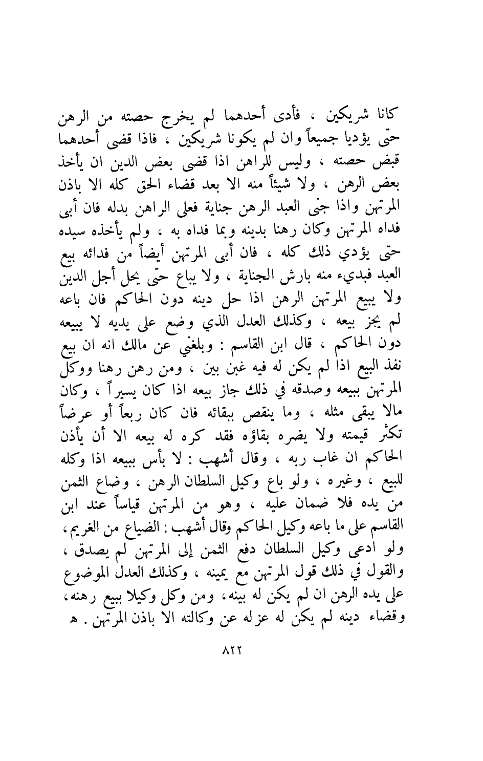 كانا شريكين فأدى احدهما لم يخرج حصته من الرهن حتى يؤديا جميعا وان لم يكونا شريكين فإذا قضى احدهما قبض حصته وليس للراهن اذا قضي بعض الدين ان يأخذ بعض الرهن ولا شيئا منه الا بعد قضاء الحق كله الا بإذن المرتهن وإذا جنى العبد الرهن جناية فعلى الراهن بدله فإن ابى فداه المرتهن وكان رهنا بدينه وبما فداه به ولم يأخذه سيده حتى يؤدي ذلك كله فإن ابى المرتهن ايضا من فدائه بيع العبد فبديء منه بإرش الجناية ولا يباع حتى يحل اجل الدين ولا يبيع المرتهن الرهن اذا حل دينه دون الحاكم فإن باعه لم يجز بيعه وكذلك العدل الذي وضع على يديه لا يبيعه دون الحاكم وقال ابن القاسم وبلغني عن مالك انه أن بيع نفذ البيع اذا لم يكن له فيه غبن بين ومن رهن رهنا ووكل المرتهن ببيعه وصدقه في ذلك جاز بيعه اذا كان يسيرا وكان مالا يبقى مثله وما ينقص ببقائه فإن كان ربعا أو عرضا تكثر قيمته ولا يضره بقاؤه فقد كره له بيعه الا ان يأذن الحاكم إن غاب ربه وقال أشهب لا بأس ببيعه إذا وكله للبيع وغيره ولو باع وكيل السلطان الرهن وضاع الثمن من يده فلا ضمان عليه وهو من المرتهن قياسا عند ابن القاسم على ما باعه وكيل الحاكم وقال أشهب الضياع من الغريم ولو ادعى وكيل السلطان دفع الثمن الى المرتهن لم يصدق والقول في ذلك قول المرتهن مع يمينه وكذلك العدل الموضوع على يده الرهن ان لم يكن له بينة ومن وكل وكيلا ببيع رهنه وقضاء دينه لم يكن له عزله عن وكالته الا بإذن المرتهن