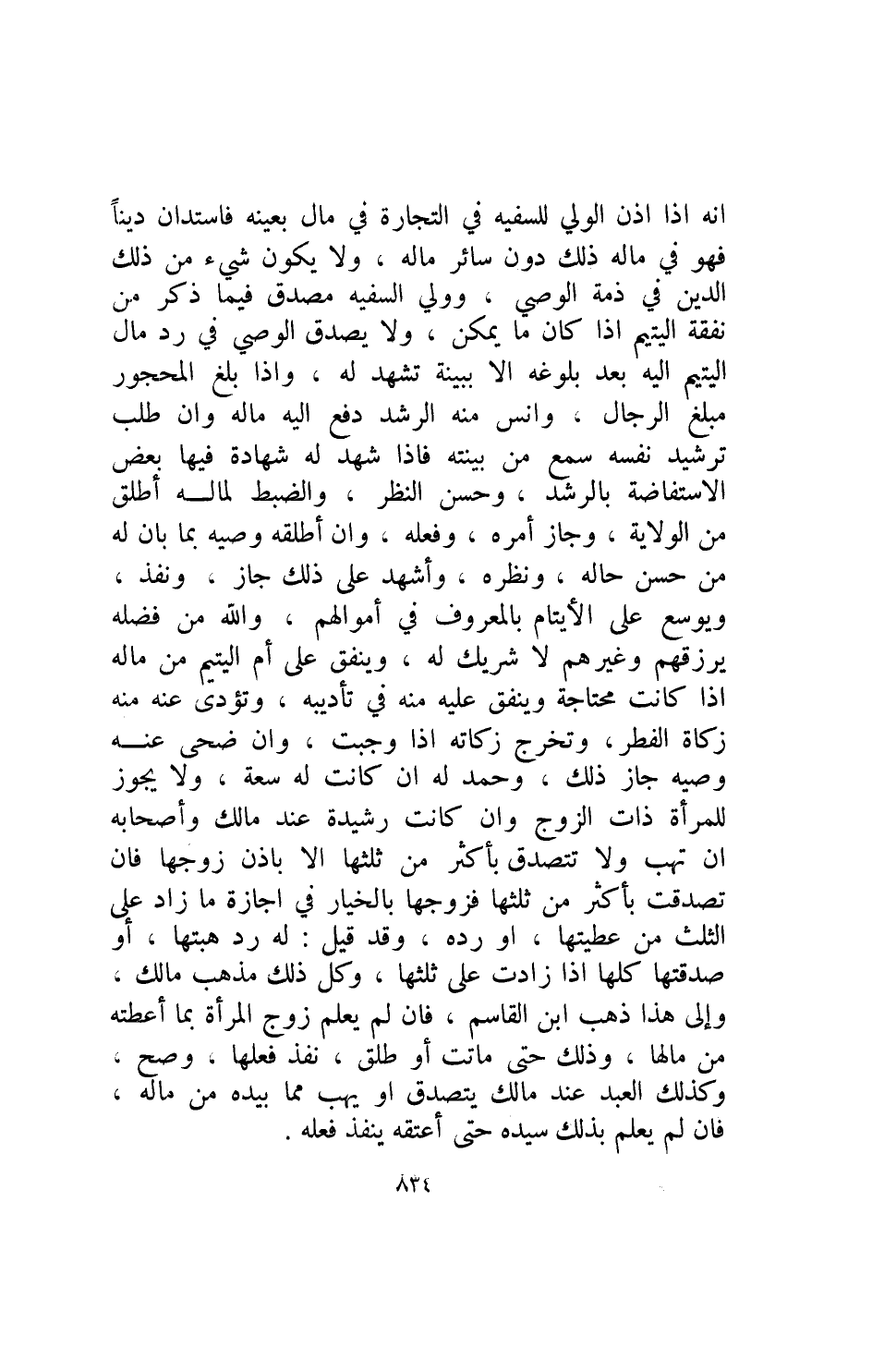 انه إذا إذن الولي للسفيه في التجارة في مال بعينه فاستدان دينا فهو في ماله ذلك دون سائر ماله ولا يكون شيء من ذلك الدين في ذمة الوصي وولي السفيه مصدق فيما ذكر من نفقة اليتيم إذا كان ما يمكن ولا يصدق الوصي في رد مال اليتيم إليه بعد بلوغه الا ببينة تشهد له وإذا بلغ المحجور مبلغ الرجال وانس منه الرشد دفع إليه ماله وان طلب ترشيد نفسه سمع من بينته فإذا شهد له شهادة فيها بعض الاستفاضة بالرشد وحسن النظر والضبط لماله أطلق من الولاية وجاز أمره وفعله وان أطلقه وصيه بما بان له من حسن حاله ونظره وأشهد على ذلك جاز ونفذ ويوسع على الأيتام بالمعروف في أموالهم والله من فضله يرزقهم وغيرهم لا شريك له وينفق على أم اليتيم من ماله إذا كانت محتاجة وينفق عليه منه في تأديبة وتؤدي عنه منه زكاة الفطر وتخرج زكاته إذا وجبت وان ضحى عنه وصيه جاز ذلك وحمد له ان كانت له سعة ولا يجوز للمرأة ذات الزوج وان كانت رشيدة عند مالك وأصحابه ان تهب ولا تتصدق باكثر من ثلثها إلا بإذن زوجها فإن تصدقت بأكثر من ثلثها فزوجها بالخيار في غجازة ما زاد على الثلث من عطيتها أو رده وقد قيل له رد هبتها أو صدقتها كلها إذا زادت على ثلثها وكل وكل ذلك مذهب مالك وإلى هذا ذهب ابن القاسم فإن لم يعلم زوج المرأة بما أعطيته من مالها وذلك حتى ماتت أو طلق نفذ فعلها وصح وكذلك العبد عند مالك يتصدق أو يهب مما بيده من ماله فإن لم يعلم بذلك سيده حتى أعتقه ينفذ فعله