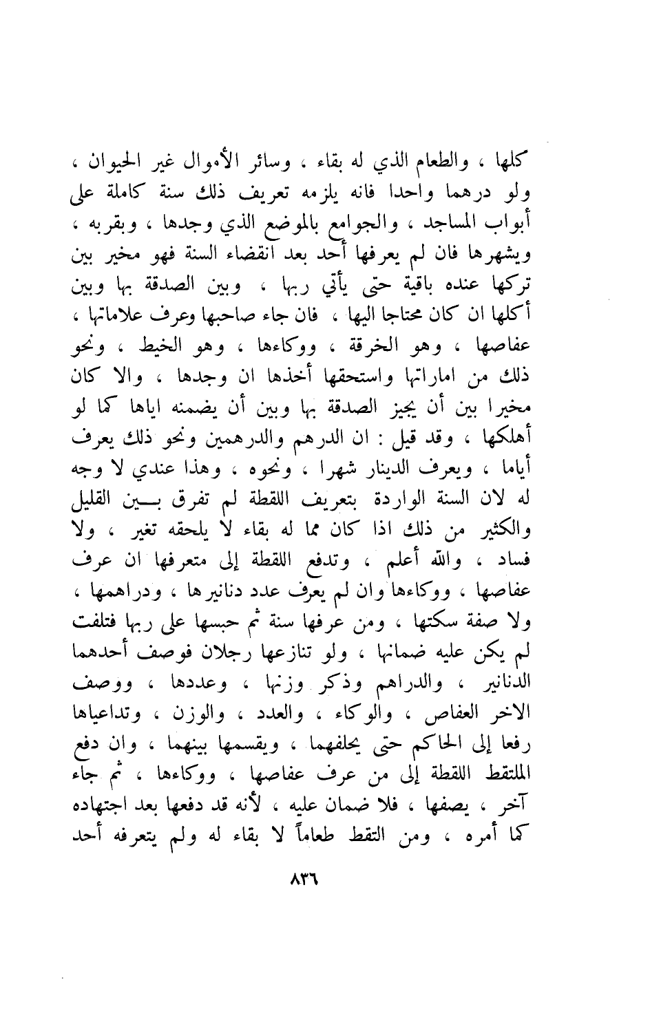 كلها والطعام الذى له بقاء وسائر الأموال غير الحيوان ولو درهما واحدا فإنه يلزمه تعريف ذلك سنة كاملة على أبواب المساجد والجوامع بالموضع الذى وجدها وبقربه ويشهرها فإن لم يعرفها أحد بعد انقضاء السنة فهو مخير بين تركها عنده باقية حتة يأتى ربها وبين الصدقة بها وبين أكلها إن كان محتاجا إليها فإن جاء صاحبها وعرف علاماتها عفاصها وهو الخرقة ووكاءها وهو الخيط ونحو ذلك من اماراتها واستحقها أخذها ان وجدها والا كان مخيرا بين أن يجيز الصدقة بها وبين أن يضمنه اياها كما لو أهلكها وقد قيل ان الدرهم والدرهمين ونحو ذلك يعرف أياما ويعرف الدينار شهرا ونحوه وهذا عندى لا وجه له لأن السنة الواردة بتعريف اللقطة لم تفرق بين القليل والكثير من ذلك إذا كان مما له بقاء لا يلحقه تغير ولا فساد والله اعلم وتدفع اللقطة إلى متعرفها ان عرف عفاصها ووكاءها وان لم يعرف عدد دنانيرها ودراهمها ولا صفة سكتها ومن عرفها ثم حبسها على ربها فتلفت لم يكن عليه ضمانها ولو تنازعها رجلان فوصف أحدهما الدنانير والدراهم وذكر وزنها وعددها ووصف الآخر العفاص والوكاء والعدد والوزن وتداعياهما رفعا إلى الحاكم حتى يحلفهما ويقسمهما بينهما وان دفع الملتقط إلى من عرف عفاصها ووكاءها ثم جاء آخر يصفها فلا ضمان عليه لأنه قد دفعها بعد اجتهاده كما أمره ومن التقط طعاما لا بقاء له ولم يتعرفه أحد