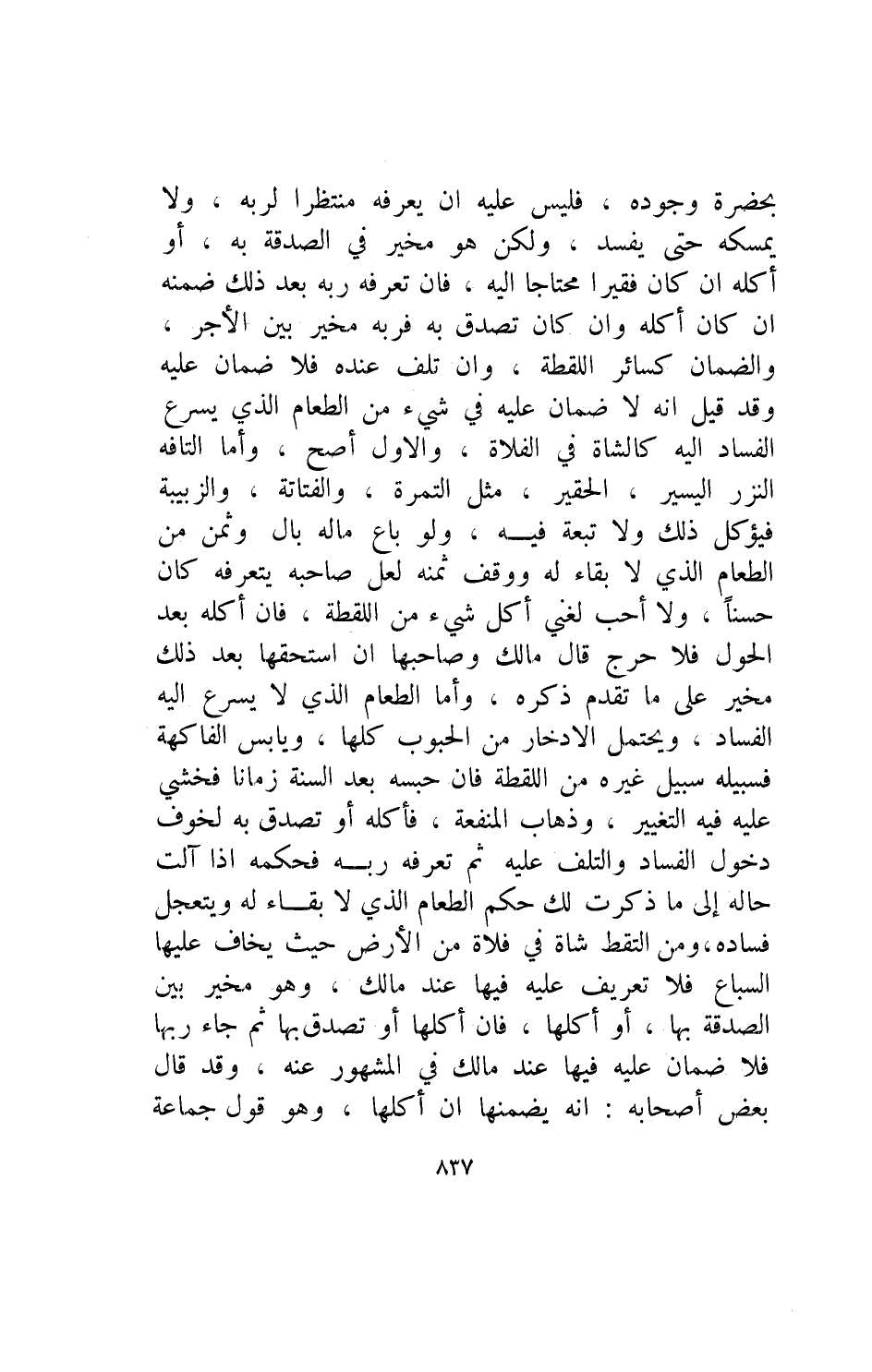 بحضرة وجوده فليس عليه ان يعرفه منتظرا لربه ولا يمسكه حتى يفسد ولكن هو مخير في الصدقة به أو أكله إن كان فقيرا محتاجا إليه فإن تعرفه ربه بعد ذلك ضمنه ان كان أكله وان كان تصدق به فربه مخير بين الأجر والضمان كسائر اللقطة وان تلف عنده فلا ضمان عليه وقد قيل انه لا ضمان عليه في شيء من الطعام الذي يسرع الفساد إليه كالشاة في الفلاة والاول أصح وأما التافه النزر اليسير الحقير مثل التمرة والفتاتة والزبيبة فيؤكل ذلك ولا تبعة فيه ولو باع ماله بال وثمن من الطعام الذى لا بقاء له ووقف ثمنه لعل صاحبه يتعرفه كان حسنا ولا أحب لغني أكل شيء من اللقطة فإن أكله بعد الحول فلا حرج قال مالك وصاحبها أن استحقها بعد ذلك مخير على ما تقدم ذكره وأما الطعام الذي لا يسرع إليه الفساد ويحتمل الادخار من الحبوب كلها ويابس الفاكهة فسبيله سبيل غيره من اللقطة فإن حبسه بعد السنة زمانا فخشي عليه فيه التغيير وذهاب المنفعة فأكله أو تصدق به لخوف دخول الفساد والتلف عليه ثم تعرفه ربه فحكمه إذا آلت حاله غلى ما ذكرت لك حكم الطعام الذى لا بقاء له ويتعجل فساده ومن التقط شاة فى فلاة من الأرض حيث يخاف عليها السباع فلا تعريف عليه فيها عند مالك وهو مخير بين الصدقة بها أو أكلها أو تصدق بها ثم جاء ربها فلا ضمان عليه فيها عند مالك في المشهور عنه وقد قال بعض أصحابه انه يضمنها ان أكلها وهو قول جماعة