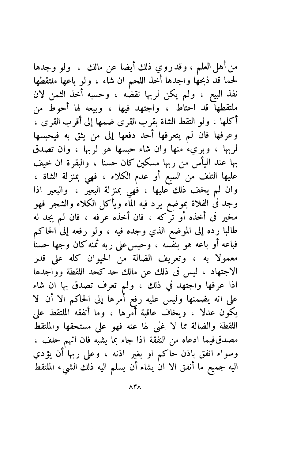 من أهل العلم وقد روي ذلك أيضا عن مالك ولو وجدها لحما قد ذبحها واجدها أخذ اللحم ان شاء ولو باعها ملتقطها نفذ البيع ولم يكن لربها نقضه وحسبه أخذ الثمن لأن ملتقطها قد احتاط واجتهد فيها وبيعه لها أحوط من أكلها ولو التقط الشاة بقرب القرى ضمها إلى أقرب القرى وعرفها فإن لم يتعرفها أحد دفعها إلى من يثق به فيحبسها لربها وبرىء منها وان شاء حبسها هو لربها وان تصدق بها عند اليأس من ربها مسكين كان حسنا والبقرة ان خيف عليها التلف من السبع أو عدم الكلاء فهي بمنزلة الشاة وان لم يخف ذلك عليها فهي بمنزلة البعير والبعير إذا وجد في الفلاة بموضع يرد فيه الماء ويأكل الكلاء والشجر فهو مخير في أخذه أو تركه فإن أخذه عرفه فإن لم يجد له طالبا رده إلى الموضع الذى وجده فيه ولو رفعه إلى الحاكم فباعه أو باعه هو بنفسه وحبس على ربه ثمنه كان وجها حسنا معمولا به وتعريف الضالة من الحيوان كله على قدر الاجتهاد ليس في ذلك عن مالك حد كحد اللقطة وواجدها إذا عرفها واجتهد في ذلك ولم تعرف تصدق بها ان شاء على أنه يضمنها وليس عليه رفع أمرها إلى الحاكم غلا أن لا يكون عدلا ويخاف عاقبة أمرها وما أنفقه الملتقط على اللقطة والضالة مما لا غنى لها عنه فهو على مستحقها والملتقط مصدق فيما ادعاه من النفقة إذا جاء بما يشبه فإن اتهم حلف وسواء انفق بإذن حاكم أو بغير إذنه وعلى ربها أن يؤدي إليه جميع ما أنفق إلا أن يشاء أن يسلم إليه ذلك الشيء الملتقط