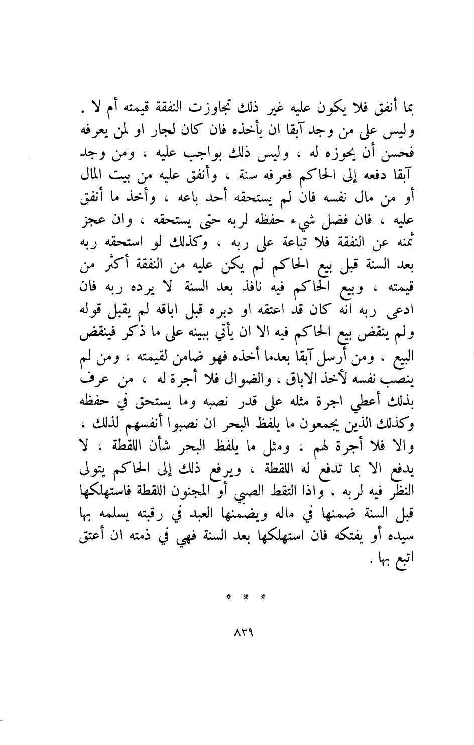 بما أنفق فلا يكون عليه غير ذلك تجاوزت النفقة قيمته أم لا وليس على من وجد آبقا أن يأخذه فإن كان لجار أو لمن يعرفه فحسن أن يجوزه له وليس ذلك بواجب عليه ومن وجد آبقا دفعه إلى الحاكم فعرفه سنة وأنفق عليه من بيت المال أو من مال نفسه فإن لم يستحقه أحد باعه وأخذ ما أنفق عليه فإن فضل شيء حفظه لربه حتة يستحقه السنة قبل بيع الحاكم لم يكن عليه من النفقة أكثر من قيمته وبيع الحاكم فيه نافد بعد السنة لا يرده ربه فإن ادعى ربه انه كان قد اعتقه أو دبره قبل اباقه لم يقبل قوله ولم ينقض بيع الحاكم فيه إلا أن يأتى ببينة على ما ذكر فينقض البيع ومن أرسل آبقا بعدما أخذه فهو ضامن لقيمته ومن لم ينصب نفسه لأخذ الاباق والضوال فلا أجرة له من عرف بذلك أعطى أجرة مثله على قدر نصبه وما يستحق في حفظه وكذلك الذين يجمعون ما يلفظ البحر ان نصبوا أنفسهم لذلك والا فلا أجرة لهم ومثل ما يلفظ البحر شأن اللقطة لا يدفع الا بما تدفع له اللقطة ويرفع ذلك إلى الحاكم يتولى النظر فيه لربه وإذا التقط الصبي أو المجنون اللقطة فاستهلكها قبل السنة ضمنها في ماله ويضمنها العبد في رقبته يسلمه بها سيده أو يفتكه فإن استهلكها بعد السنة فهي في ذمته ان أعتق أتبع بها