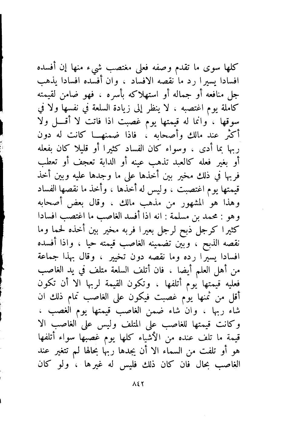كلها سوى ما تقدم وصفه فعلى مغتصب شيء منها إن أفسده افسادا يسيرا رد ما نقصه الافساد وأن أفسده افسادا يذهب جل منافعه أو جماله أو استهلاكه بأسره فهو ضامن لقيمته كاملة يوم اغتصبه لا ينظر إلى زيادة السلعة في نفسها ولا في سوقها وإنما له قيمتها يوم غصبت إذا فاتت لا أقل ولا أكثر عند مالك وأصحابه فإذا ضمنها كانت له دون ربها بما أدى وسواء كان الفساد كثيرا أو قليلا كان بفعله او بغير فعله كالعبد تذهب عينه أو الدابة تعجف أو تعطب فربها في ذلك مخير بين أخذها على ما وجدها عليه وبين أخذ قيمتها يوم اغتصبت وليس له أخذها وأخذ ما نقصها الفساد وهذا هو المشهور من مذهب مالك وقال بعض أصحابه وهو محمد بن مسلمة انه إذا افسد الغاصب ما اغتصب افسادا كثيرا كرجل ذبح لرجل بعيرا فربه مخير بين أخذه لحما وما نقصه الذبح وبين تضمينه الغاصب قيمته حيا وإذا أفسده افسادا يسيرا رده وما نقصه دون تخيير وقال بهذا جماعة من اهل العلم أيضا فإن أتلف السلعة متلف في يد الغاصب فعليه قيمتها يوم أتلفها وتكون القيمة لربها إلا ان تكون أقل من ثمنها يوم غصبت فيكون على الغاصب تمام ذلك ان شاء ربها وان شاء ضمن الغاصب قيمتها يوم الغصب وكانت قيمتها للغاصب على المتلف وليس على الغاصب إلا قيمة ما تلف عنده من الأشياء كلها يوم غصبها سواء أتلفها هو أو تلفت من السماء الا أن يجدها ربها بحالها لم تتغير عند الغاصب بحال فإن كان ذلك فليس له غيرها ولو كان