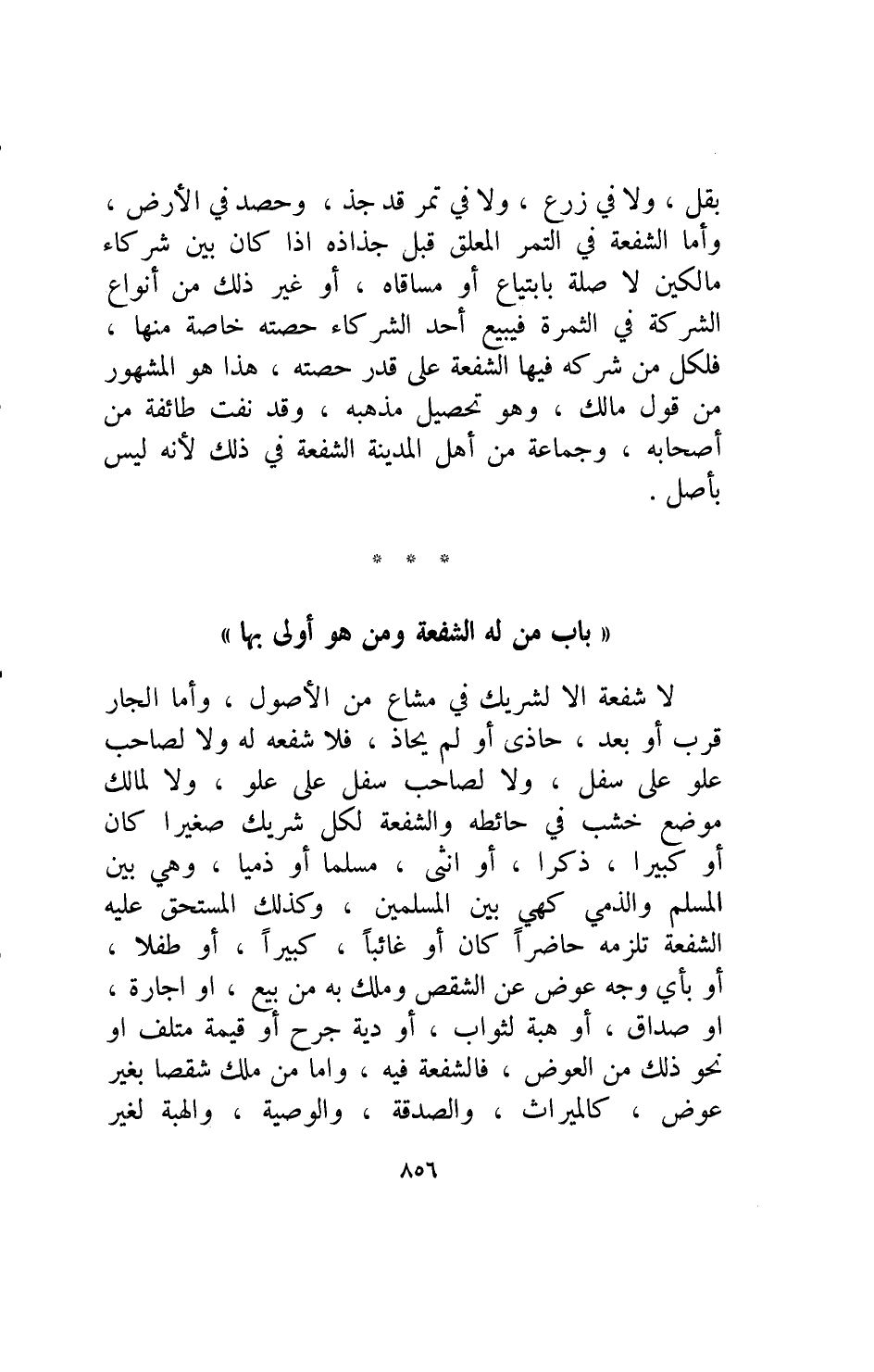 لا شفعة إلا لشريك في مشاع من الأصول وأما الجار قرب أو بعد حاذى أو لم يحاذ فلا شفعة له ولا لصاحب علو على سفل ولا لصاحب سفل على علو ولا لمالك موضع خشب في حائطه والشفعة لكل شريك صغيرا كان أو كبيرا ذكرا أو انثى مسلما أو ذميا وهي بين المسلم والذمي كهي بين المسلمين وكذلك المستحق عليه الشفعة تلزمه حاضرا كان أو غائبا كبيرا أو طفلا أو بأي وجه عوض عن الشقص وملك به من بيع أو اجارة أو صداق أو هبة لثواب أو دية جرح أو قيمة متلف أو نحو ذلك من العوض فالشفعة فيه واما من ملك شقصا بغير عوض كالميراث والصدقة والوصية والهبة لغير