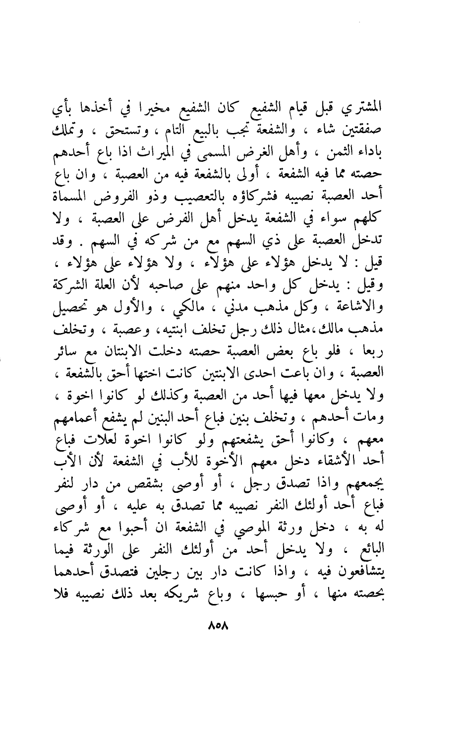 المشتري قبل قيام الشفيع كان الشفيع مخيرا في أخذها بأي صفقتين شاء والشفعة تجب بالبيع التام وتستحق وتملك باداء الثمن وأهل الغرض المسمى في الميراث إذا باع أحدهم حصته مما فيه الشفعة أولى بالشفعة فيه من العصبة وأن باع أحد العصبة نصيبه فشركاؤه بالتعصيب وذو الفروض المسماة كلهم سواء في الشفعة يدخل أهل الفرض على العصبة ولا تدخل العصبة على ذي السهم مع من شركه في السهم وقد قيل لا يدخل هؤلاء على هؤلاء ولا هؤلاء على هؤلاء وقيل يدخل كل واحد منهم على صاحبه لأن العلة الشركة والإشاعة وكل مذهب مدني مالكي والأول هو تحصيل مذهب مالك مثال ذلك رجل تخلف ابنتيه وعصبة وتخلف ربعا فو باع بعض العصبة حصته دخلت الابنتان مع سائر العصبة وان باعت احدى الابنتين كانت اختها أحق بالشفعة ولا يدخل معها فيها أحد من العصبة وكذلك لو كانوا اخوة ومات أحدهم وتخلف بنين فباع أحد البنين لم يشفع أعمامهم معهم وكانوا أحق بشفعتهم ولو كان أخوة لعلات فباع أحد الأشقاء دخل معهم الأخوة للأب في الشفعة لأن الأب يجمعهم وإذا تصدق رجل أو أوصى بشقص من دار لنفر فباع أحد أولئك النفر نصيبه مما تصدق به عليه أو أوصى له به دخل ورثة الموصي في الشفعة أن أحبوا مع شركاء البائع ولا يدخل أحد من أولئك النفر على الورثة فيما يتشافعون فيه وإذا كانت دار بين رجلين فتصدق أحدهما بحصته منها أو حبسها وباع شريكه بعد ذلك نصيبه فلا