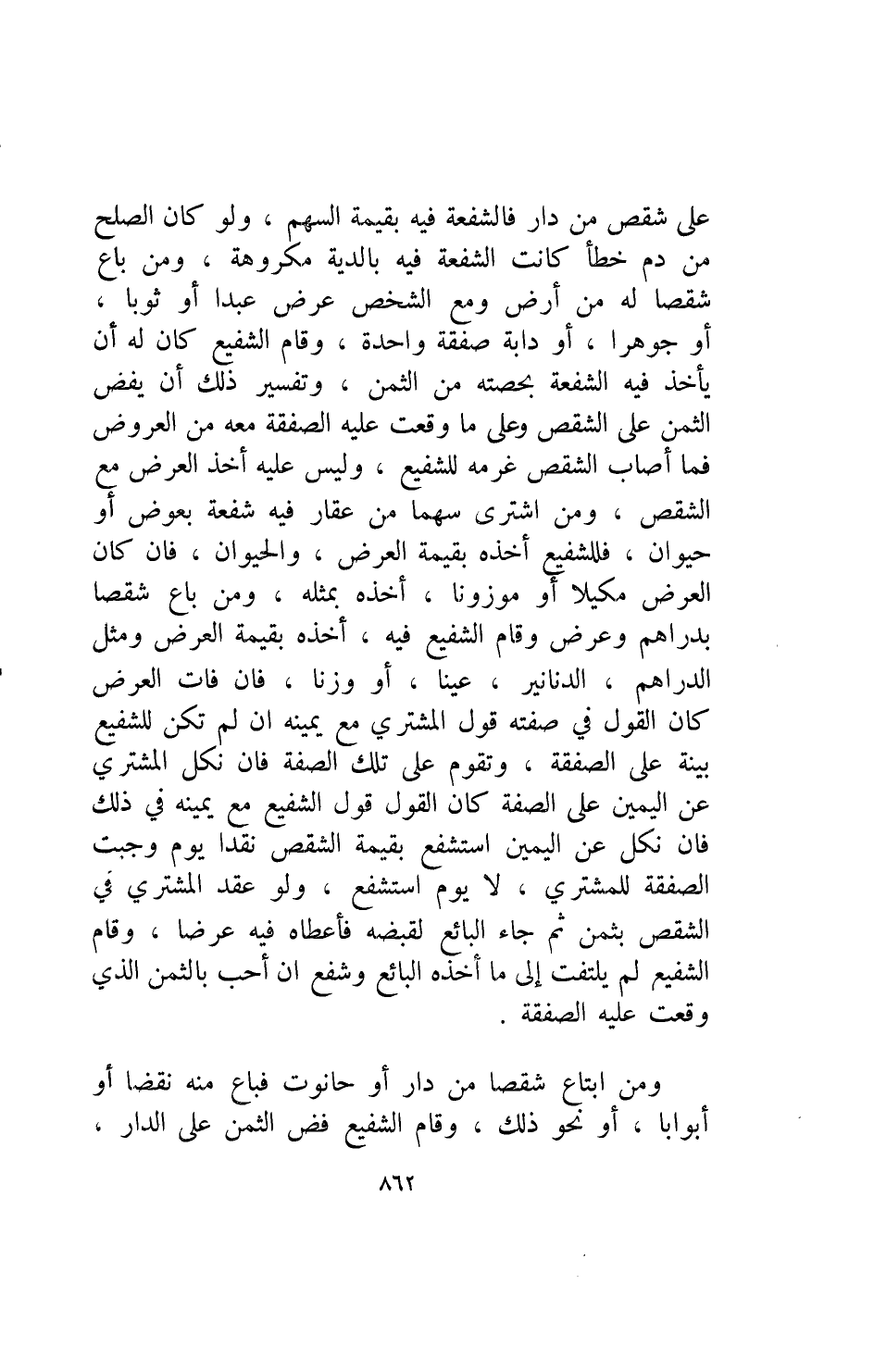 على شقص من دار فالشفعة فيه بقيمة السهم ولو كان الصلح من دم خطأ كانت الشفعة فيه بالدية مكروهة ومن باع شقصا له من أرض ومع الشخص عرض عبدا أو ثوبا أو جوهرا أو دابة صفقة واحدة وقام الشفيع كان له أن يأخذ فيه الشفعة بحصته من الثمن وتفسير ذلك أن يفض الثمن على الشقص وعلى ما وقعت عليه الصفقة معه من العروض فما أصاب الشقص غرمه للشفيع وليس عليه أخذ العرض مع الشقص ومن اشترى سهما من عقار فيه شفعة بعوض أو حيوان فللشفيع أخذه بقيمة العرض والحيوان فإن كان العرض مكيلا أو موزونا أخذه بمثله ومن باع شقصا بدراهم وعرض وقام الشفيع فيه أخذه بقيمة العرض ومثل الدراهم الدنانير عينا أو وزنا فإن فات العرض كان القول في صفته قول المشتري مع يمينه ان لم تكن للشفيع بينه على الصفقة وتقوم على تلك الصفقة فإن نكل المشتري عن اليمين على الصفة كان القول قول الشفيع مع يمينه في ذلك فإن نكل عن اليمين استشفع بقيمة الشقص نقدا يوم وجبت الصفقة للمشتري لا يوم استشفع ولو عقد المشتري في الشقص بثمن ثم جاء البائع لقبضه فأعطاه فيه عرضا وقام الشفيع لم يلتفت إلى ما أخذه البائع وشفع أن أحب بالثمن الذي وقعت عليه الصفقة