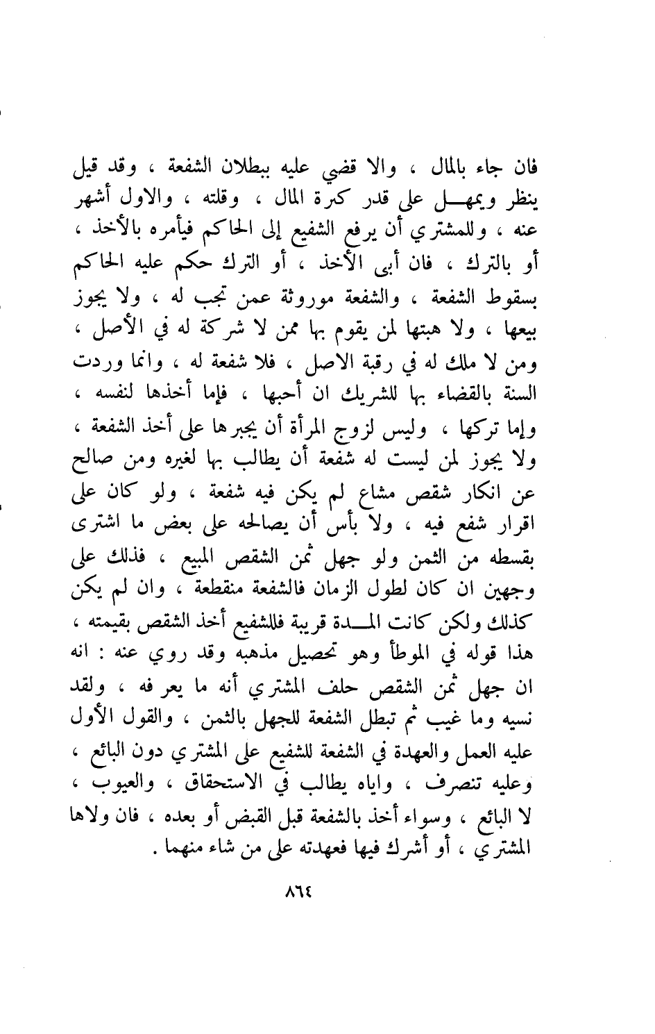 فإن جاء بالمال والا قضي عليه ببطلان الشفعة وقد قيل ينظر ويمهل على قدر كثرة المال وقلته والاول أشهر عنه وللمشتري أن يرفع الشفيع إلى الحاكم فيأمره بالأخذ أو بالترك فإن أبى الأخذ أو الترك حكم عليه الحاكم بسقوط الشفعة والشفعة موروثة عمن تجب له ولا يجوز بيعها ولا هبتها لمن يقوم بها ممن لا شركة له في الأصل ومن لا ملك له في رقبة الاصل فلا شفعة له وإنما وردت السنة بالقضاء بها للشريك ان أحبها فإما أخذها لنفسه وإما تركها وليس لزوج المرأة أن يجبرها على أخذ الشفعة ولا يجوز لمن ليست له شفعة أن يطالب بها لغيره ومن صالح عن انكار شقص مشاع لم يكن فيه شفعة ولو كان على اقرار شفع فيه ولا بأس أن يصالحه على بعض ما اشترى بقسطه من الثمن ولو جهل ثمن الشقص المبيع فذلك على وجهين ان كان لطول الزمان فالشفعة منقطعة وان لم يكن كذلك ولكن كانت المدة قريبة فللشفيع أخذ الشقص بقيمته هذا قوله في الموطأ وهو تحصيل مذهبه وقد روي عنه أنه ان جهل ثمن الشقص حلف المشتري أنه ما يعرفه ولقد نسيه وما غيب ثم تبطل الشفعة للجهل بالثمن والقول الاول عليه العمل والعهدة في الشفعة للشفيع على المشتري دون البائع وعليه تنصرف وإياه يطالب في الاستحقاق والعيوب لا البائع وسواء أخذ بالشفعة قبل القبض أو بعده فإن ولاها المشتري او أشرك فيها فعهدته على من شاء منها