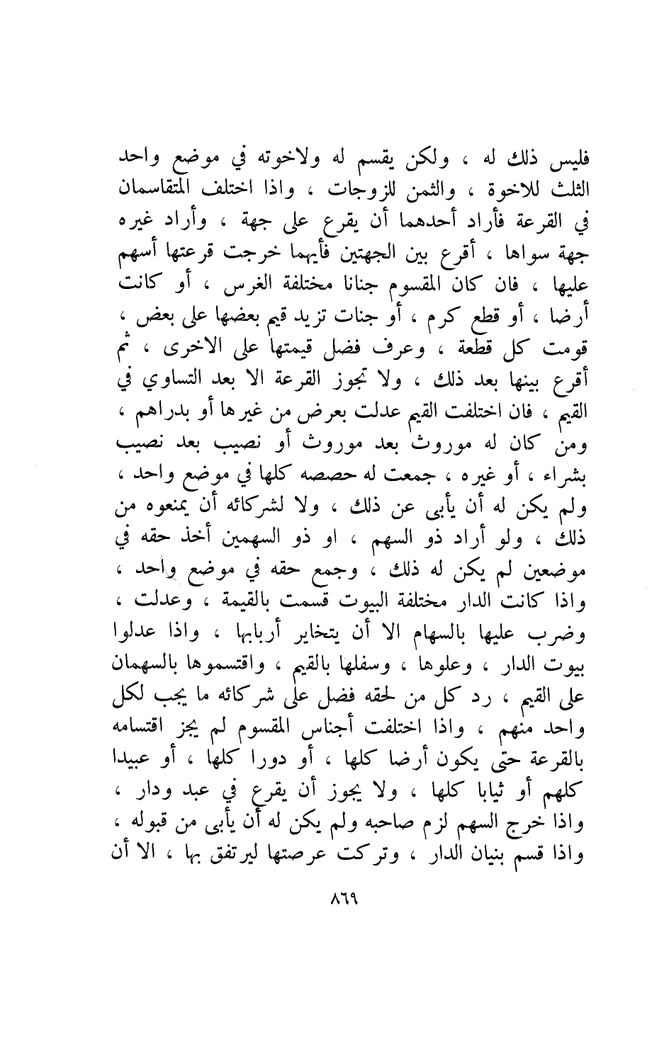 فليس ذلك له ولكن يقسم له وخوته ولإخوته في موضع واحد الثلث للإخوة والثمن للزوجات واذا اختلف المتقاسمان في القرعة فأراد أحدهما أن يقرع على جهة وأراد غيره جهة سواها أقرع بين الجهتين فأيهما خرجت قرعتها أسهم عليها فإن كان المقسوم جنانا مختلفة الغرس أو كانت أرضا أو قطع كرم أو جنات تزيد قيم بعضها على بعض قومت كل قطعة وعرف فضل قيمتها على الاخرى ثم أقرع بينها بعد ذلك ولا تجوز القرعة الا بعد التساوي في القيم فإن اختلفت القيم عدلت بعرض من غيرها أو بدراهم ومن كان له موروث بعد موروث أو نصيب بعد نصيب شراء أو غيره جمعت له حصصه كلها في موضع واحد ولم يكن له ان يأبى عن ذلك ولا لشركائه أن يمنعوه من ذلك ولو أراد ذو السهم أو ذو السهمين أخذ حقه في موضعين لم يكن له ذلك وجمع حقه في موضع واحد وإذا كانت الدار مختلفة البيوت قسمت بالقيمة وعدلت وضرب عليها بالسهام إلا أن يتخاير أربابها واذا عدلوا بيوت الدار وعلوها وسفلها بالقيم واقتسموها بالسهمان على القيم رد كل من لحقه فضل على شركائه ما يجب لكل واحد منهم وإذا اختلفت اجناس المقسوم لم يجز اقتسامه بالقرعة حتى يكون أرضا كلها أو دورا كلها أو عبيدا كلهم أو ثيابا كلها ولا يجوز أن يقرع في عبد ودار واذا خرج السهم لزم صاحبه ولم يكن له ان يأبى من قبوله واذا قسم بنيان الدار وتركت عرصتها ليرتفق بها إلا أن