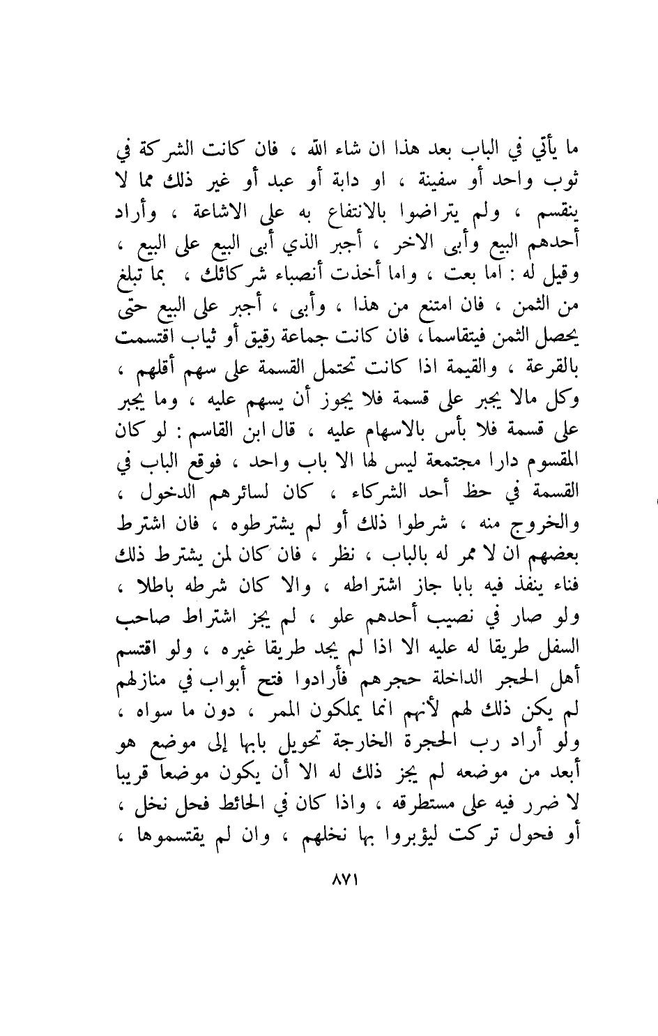 ما يأتي في الباب بعد هذا ان شاء الله فإن كانت الشركة في ثوب واحد او سفينة او دابة أو عبد أو غير ذلك مما لا ينقسم ولم يتراضوا بالانتفاع به على الاشاعة وأراد احدهم البيع وأبى الآخر أجبر الذي ابى البيع على البيع وقيل له أما بعت وأما أخذت انصباء شركائك بما تبلغ من الثمن فإن امتنع من هذا وأبى اجبر على البيع حتى يحصل الثمن فيتقاسما فإن كانت جماعة رقيق أو ثياب اقتسمت بالقرعة والقيمة اذا كانت تحتمل القسمة على سهم اقلهم وكل مالا يجبر على قسمة فلا يجوز أن يسهم عليه وما يجبر على قسمة فلا بأس بالاسهام عليه قال ابن القاسم لو كان المقسوم دار مجتمعة ليس لها الا باب واحد فوقع الباب في القسمة في حظ أحد الشركاء كان لسائرهم الدخول والخروج منه شرطوا ذلك أم لم يشترطوه فإن اشترط بعضهم أن لا ممر له بالباب نظر فإن كان لمن يشترط ذلك فناء ينفذ فيه بابا جاز اشتراطه وإلا كان شرطه باطلا ولو صار في نصيب احدهم علو لم يجز اشتراط صاحب السفل طريقا له عليه إلا اذا لم يجد طريقا غيره ولو اقتسم أهل الحجر الداخلة فأرادوا فتح ابواب في منازلهم لم يكن لك لهم لأنهم إنما يملكون الممر دون ما سواه ولو أراد رب الحجرة الخارجة تحويل بابها الى موضع هو ابعد لم يجز ذلك له إلا أن يكون موضعا قريبا لا ضرر فيه على مستطرقه وإذا كان في الحائط فحل نخل أو فحول تركت ليؤبروا بها نخلهم وإن لم يقتسموها