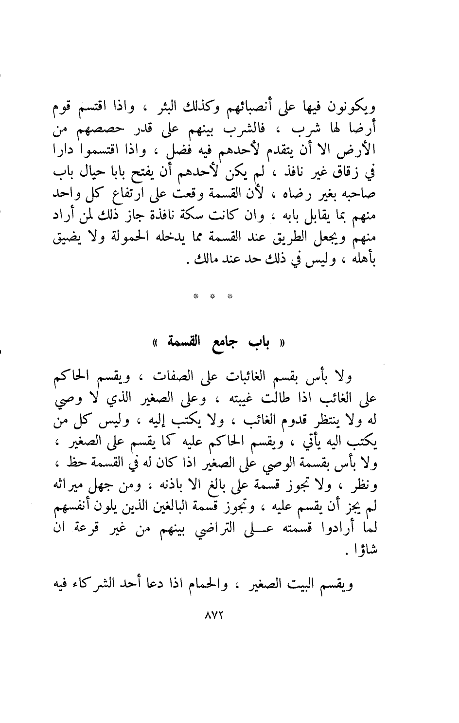 ولا بأس بقسم الغائبات على الصفات ويقسم الحاكم على الغائب اذا طالت غيبته وعلى الصغير الذي لا وصي له ولا ينتظر قدوم الغائب ولا يكتب اليه وليس كل من يكتب اليه يأتي ويقسم الحاكم عليه كما يقسم على الصغير ولا بأس بقسمة الوصي على الصغير إذا كان له في القسمة حظ ونظر ولا تجوز قسمة على بالغ الا بإذنه ومن جهل ميراثه لم يجز أن يقسم عليه وتجوز قسم البالغين الذي يلون انفسهم لما ارادوا قسمته على التراضي بينهم من غير قرعة ان شاؤا ويقسم البيت الصغير والحمام أذا دعا احد الشركاء فيه