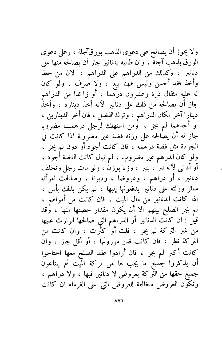 ولا يجوز أن يصالح على دعوى الذهب بورق آجلة وعلى دعوى الورق بذهب آجلة وان طالبه بدنانير جاز ان يصالحه منها على دنانير وكذلك من الدراهم على الدراهم لأن من حط وأخذ فقد أحسن وليس ههنا بيع ولا صرف ولو كان عليه مثقال ذرة وعشرون درهما أو زائدا من الدراهم جاز أن يصالحه من ذلك على دنانير لانه أخذ ديناره وأخذ دينارا آخر مكان الدراهم وترك الفضل فإن أخر الدينارين أو احدهما لم يجز ومن استهلك لرجل درهما مضروبا جاز له أن يصالحه على وزنه فضة غير مضروبة اذا كانت في الجودة مثل فضة درهمه فإن كانت أجود أو دون لم يجز ولو كان الدرهم غير مضروب لم تبال كانت الفضة اجود او ادنى لانه تبر بتبر وزنا بوزن ولو مات رجل وتخلف دنانير او دراهم وعروضا وديونا وصالحت امرأته سائر ورثته على دنانير يدفعونها اليها لم يكن بذلك بأس اذا كانت الدنانير من مال الميت فإن كانت أموالهم لم يجز الصلح بينهم إلا ان يكون مقدار حصتها منها وقد قيل ان كانت الدنانير او الدراهم التي صالحها الوارث عليها من غير التركة لم يجز قلت أو كثرت وإن كانت من التركة نظر فإن كانت قدر مورثها او أقل جاز وان كانت أكبر لم يجز فإن أرادوا عقد الصلح معها احتاجوا ان يذكوا جميع ما يجب لها من تركة الميت ثم يبتاعون جميع حقها من التركة بعروض لا دنانير فيها ولا دراهم وتكون العروض مخالفة للعروض التي على الغرماء ان كانت