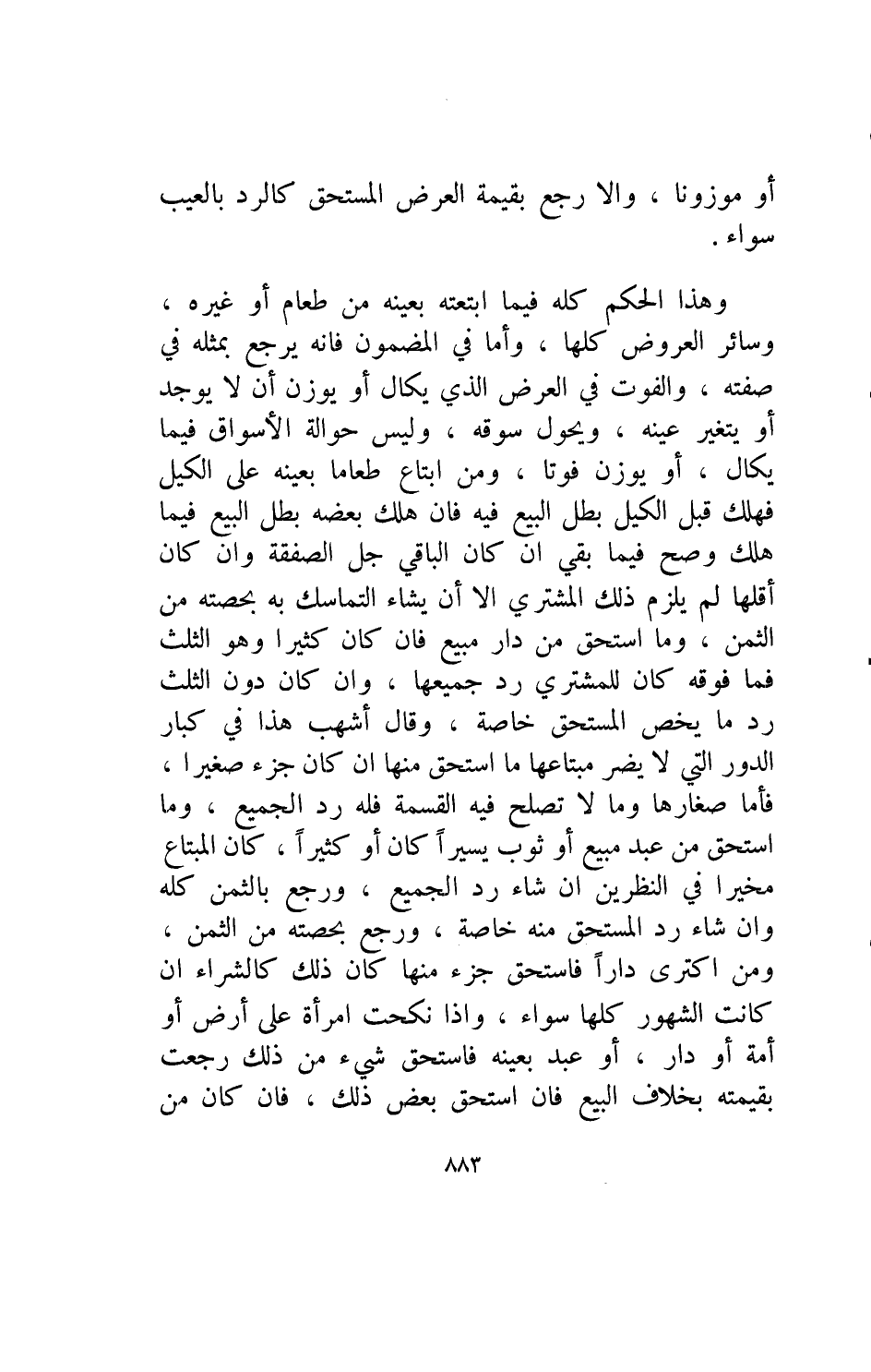 او موزونا والا رجع بقيمة العرض المستحق كالرد بالعيب سواء وهذا الحكم كله فيما ابتعته بعينه من طعام أو غيره وسائر العروض كلها وأما في المضمون فإنه يرجع بمثله في صفته والفوت في العرض الذي يكال أو يوزن أن لا يوجد أو يتغير عينه ويحول سوقه وليس حوالة الاسواق فيما يكال او يوزن فوتا ومن ابتاع طعاما بعينه على الكيل فهلك قبل الكيل بطل البيع فيه فإن هلك بعضه بطل البيع فيما هلك وصح فيما بقي ان كان الباقي جل الصفقة وان كان اقلها لم يلزم ذلك المشتري الا ان يشاء التماسك به بحصته من الثمن وما استحق من دار مبيع فإن كان كثيرا وهو الثلث فما فوقه كان للمشتري رد جميعا وان كان دون الثلث رد ما يخص المستحق خاصة وقال اشهب هذا في كبار الدور التي لايضر مبتاعها ما استحق منها ان كان جزء صغيرا فأما صغارها وما لاتصلح فيه القسمة فله رد الجميع وما استحق من عبد مبيع او ثوب يسيرا كان او كثيرا كان المبتاع مخيرا في النظرين إن شاء رد الجميع ورجع بالثمن كله وإن شاء رد المستحق منه خاصة ورجع بحصته من الثمن ومن اكترى دارا فاستحق جزء منها كان ذلك كالشراء ان كانت الشهور كلها سواء واذا نكحت امرأة على ارض او أمة أو دار أو عبد بعينه فاستحق شيء من ذلك رجعت بقيمته بخلاف البيع فإن استحق بعض ذلك فإن كان من