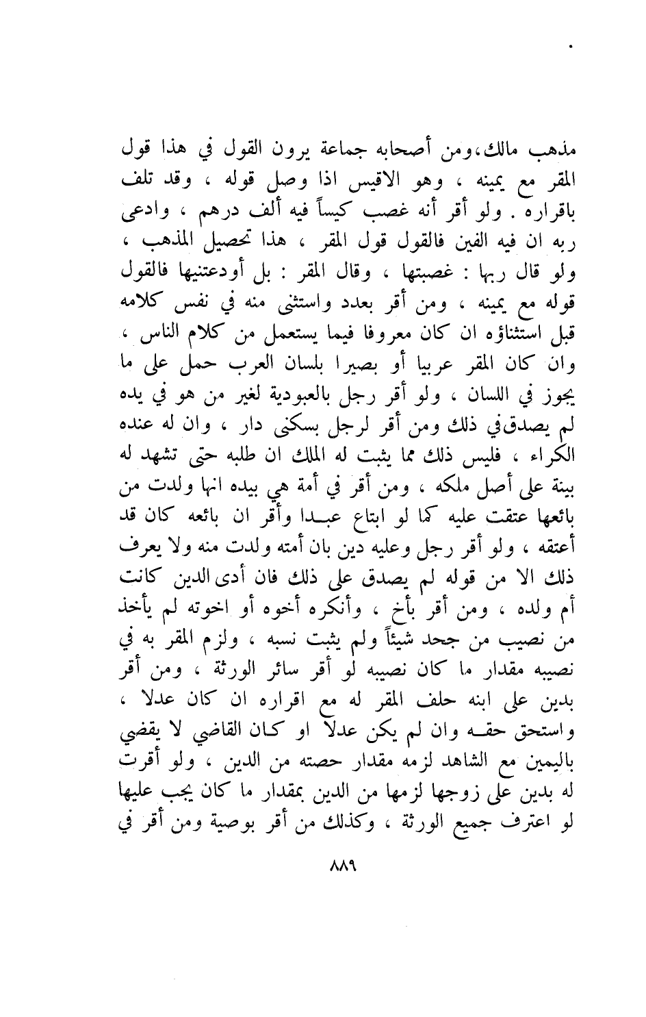 مذهب مالك ومن أصحابه جماعة يرون القول في هذا قول المقر مع يمينه وهو الأقيس إذا وصل قوله وقد تلف بإقراره ولو أقر أنه غصب كيسا فيه ألف درهم وادعى ربه أن فيه ألفين فالقول قول المقر هذا تحصيل المذهب ولو قال ربها غصبتها وقال المقر بل أودعتنيها فالقول قوله مع يمينه ومن أقر بعدد واستثنى منه في نفس كلامه قبل استثناؤه إن كان معروفا فيما يستعمل من كلام الناس وإن كان المقر عربيا أو بصيرا بلسان العربحمل على ما يجوز في اللسان ولو أقر رجل بالعبودية لغير من هو في يده لم يصدق في ذلك ومن أقر لرجل بسكنى دار وأن له عنده الكراء فليس ذلك مما يثبت له الملك إن طلبه حتى تشهد له بينة على أصل مكله ومن أقر في أمة هي بيده أنها ولدت من بائعها عتقت عليه كما لو ابتاع عبدا وأقر أن بائعه كان قد أعتقه ولو أقر رجل وعليه دين بأن أمته ولدت منه ولا يعرف ذلك إلا من قوله لم يصدق على ذلك فإن أدى الدين كانت أم ولده ومن أقر بأخ وأنكره أخوه أو أخوته لم يأخذ من نصيب من جحد شيئا ولم يثبت نسبه ولزم المقر به في نصيبه مقدار ما كان نصيبه لو أقر سائر الورثة ومن أقر بدين على ابنه حلف المقر له مع إقراره إن كان عدلا واستحق حقه وإن لم كين عدلا أو كانالقاضي لا يقضي باليمين مع الشاهد لزمه مقدار حصته من الدين ولو أقرت له بدين على زوجها لزمها من الدين بمقدار ما كان يجب عليها لو اعترف جميع الورثة وكذلك من أقر بوصية ومن أقر في