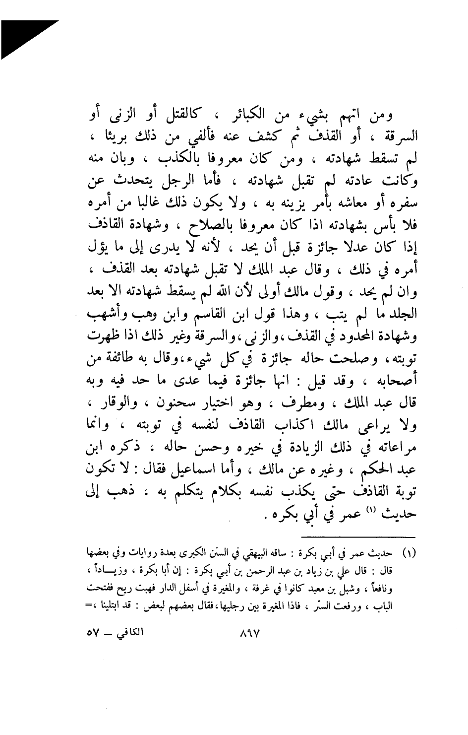 ومن اتهم بشيء من الكبائر كالقتل أو الزنى أو السرقة أو القذف ثم كشف عنه فألفي من ذلك بريئا لم تسقط شهادته ومن كان معروفا بالكذب وبان منه وكانت عادته لم تقبل شهادته فأما الرجل يتحدث عن سفره أو معاشه بأمر يزينه به ولا يكون ذلك غالبا من أمره فلا بأس بشهادته إذا كان معروفا بالصلاح وشهادة القاذف إذا كان عدلا جائزة قبل أن يحد لأنه لا يدري إلى ما يؤل أمره في ذلك وقال عبد الملك لا تقبل شهادته بعد القذف وأن لم يحد وقول مالك أولى لأن الله لم يسقط شهادته إلا بعد الجلد ما لم يتب وهذا قول ابن القاسم وابن وهب وأشهب وشهادة المحدود في القذف والزنى والسرقة وغير ذلك إذا ظهرت توبته وصلحت حاله جائزة في كل شيء وقال به طائفة من أصحابه وقد قيل إنها جائزة فيما عدى ما حد فيه وبه قال عبد الملك ومطرف وهو اختيار سحنون والواقر ولا يراعي مالك إكذاب القاذف لنفسه في توبته وإنما مراعاته في ذلك الزيادة في خيره وحسن حاله ذكره ابن عبد الحكم وغيره عن مالك وأما إسماعيل فقال لا تكون توبة القاذف حتى يكذب نفسه بكلام يتكلم به ذهب إلى حديث عمر في أبي بكرة