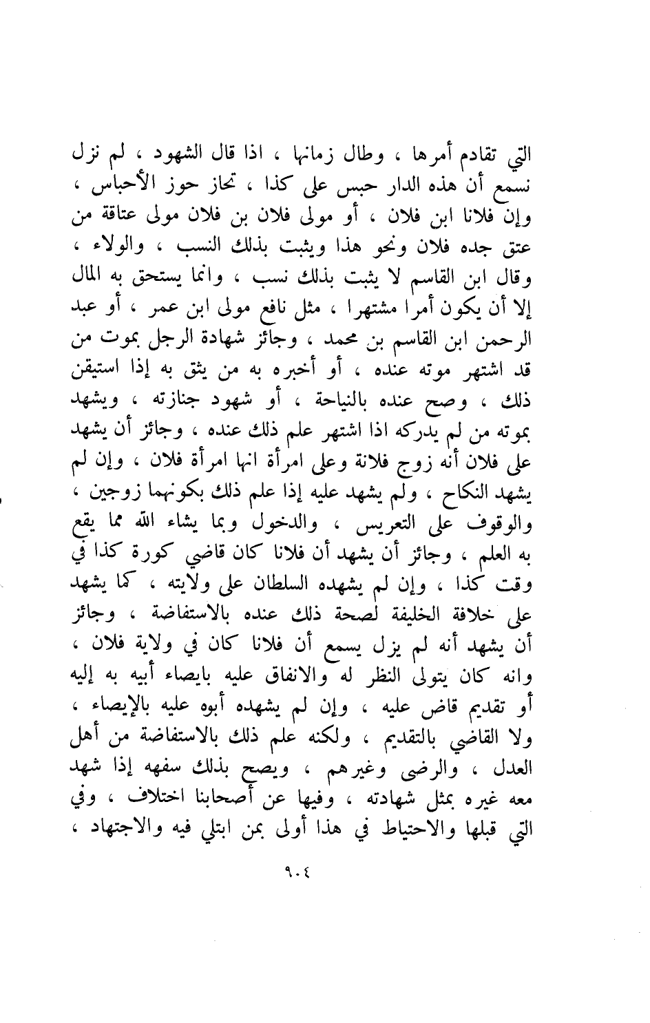 التي تقادم أمرها وطال زمانها التي تقادم أمرها وطال زمانها إذا قال الشهود لم نزل نسمع أن هذه الدار حبس على كذا تحاز حوز الأحباس وإن فلانا ابن فلان أو مولى فلان ابن فلان مولى عتاقة من عتق جده فلان ونحو هذا ويثبت بذلك النسب والولاء وقال ابن القاسم لا يثبت بذلك نسب وإنما يستحق به المال إلا أن يكون أمرا مشتهرا مثل نافع مولى ابن عمر أو عبد الرحمن بن القاسم بن محمد وجائز شهادة الرجل بموت من قد اشتهر موته عنده أأخبره به من يثق به إذا استيقن ذلك وصح عنده بالنياحة أو شهود جنازته ويشهد بموته من لم يدركه إذا اشتهر علم ذلك عنده وجائز أن يشهد على فلان أنه زوج فلانة وعلى امرأة أنها امرأة فلان وإن لم يشهد النكاح ولم يشهد عليه إذا علم ذلك بكونهما زوجين والوقوف على التعريش والدخول وبما يشاء الله مما يقع به العلم وجائز أن يشهد أن فلانا كان قاضي كورة كذا في وقت كذا وإن لم يشهده السلطان على ولاتيه كما يشهد على خلافة الخليفة لصحة ذلك عنده بالاستفاضة وجائز أن يشهد أنه لم يزل يسمع أن فلانا كان في ولاية فلان وأنه كان يتولى النظر له والإنفاق عليه بإيصار أبيه به إليه أو تقديم قاض عليه وإن لم يشهده أبوه عليه بالإيصاء ولا القاضي بالتقديم ولكنه علم ذلك بالاستفاضة من أهل العدل والرضى وغيرهم ويصح بذلك سفهه إذا شهد معه غيره بمثل شهادته وفيها عن أصبحابنا اختلاف وفي التي قبلها والاحتياط في هذا أولى بمن ابتلي فيه والاجتهاد