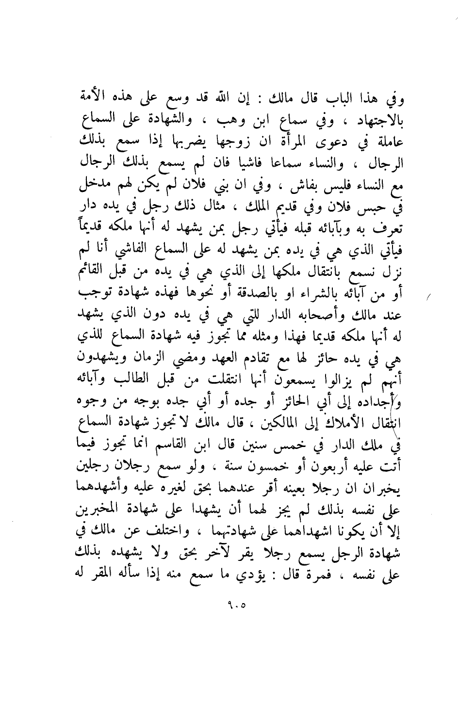 وفي هذا الباب قال مالك إن الله قد وسع على هذه الأمة بالاجتهاد وفي سماع ابن وهب والشهادة على السماع عاملة في دعوى المرأة أن زوجها يضربها إذا سمع بذلك الرجال والنساء سماعا فاشيا فإن لم يسمع بذلك الرجال مع النساء فليس بفاش وفي أن بني فلان لم يكن لهم مدخل في حبس فلان وفي قديم الملك مثال ذلك رجل في يده دار تعرف به وبآبائه قبله فيأتي رجل بمن يشهد له أنها ملكه قديما فيأتي الذي هي في يده بمن يشهد له على السماع الفاشي أنا لم نزل نسمع بانتقال ملكها إلى الذي هي في يده من قبل القائم أو من آبائه بالشراء أو بالصدقة أو نحوها فهذه شهادة توجب عند مالك وأصحابه الدار للتي هي في يده دون الذي يشهد له أنها ملكه قديما فهذا ومثله مما يجوز فيه شهادة السماع للذي هي في يده حائظ لها مع تقادم العهد ومضي الزمان ويشهدون أنهم لم يزالوا يسمعون أنها انتقلت من قبل الطالب وآبائه وأجداده إلى أبي الحائز أو جده أو أبي جده بوجه من وجوه انتقال الأملاك إلى المالكين قال مالك لا تجوز شهادة السماع في ملك الدار في خمس سنين قال ابن القاسم إنما تجوز فيما أتت عليه أربعون أو خمسون سنة ولو سمع رجلان رجلين يخبران أن رجلا بعينه أقر عندهما بحق لغيره عليه وأشهدهما على نفسه بذلك لم يجز لهما أن يشهدا على شهادة المخبرين إلا أن يكونا أشهداهما على شهادتهما واختلف عن مالك في شهادة الرجل يسمع رجلا يقر لآخر بحق ولا يشهده بذلك على نفسه فمرة قال يؤدي ما سمع منه إذا سأله المقر له