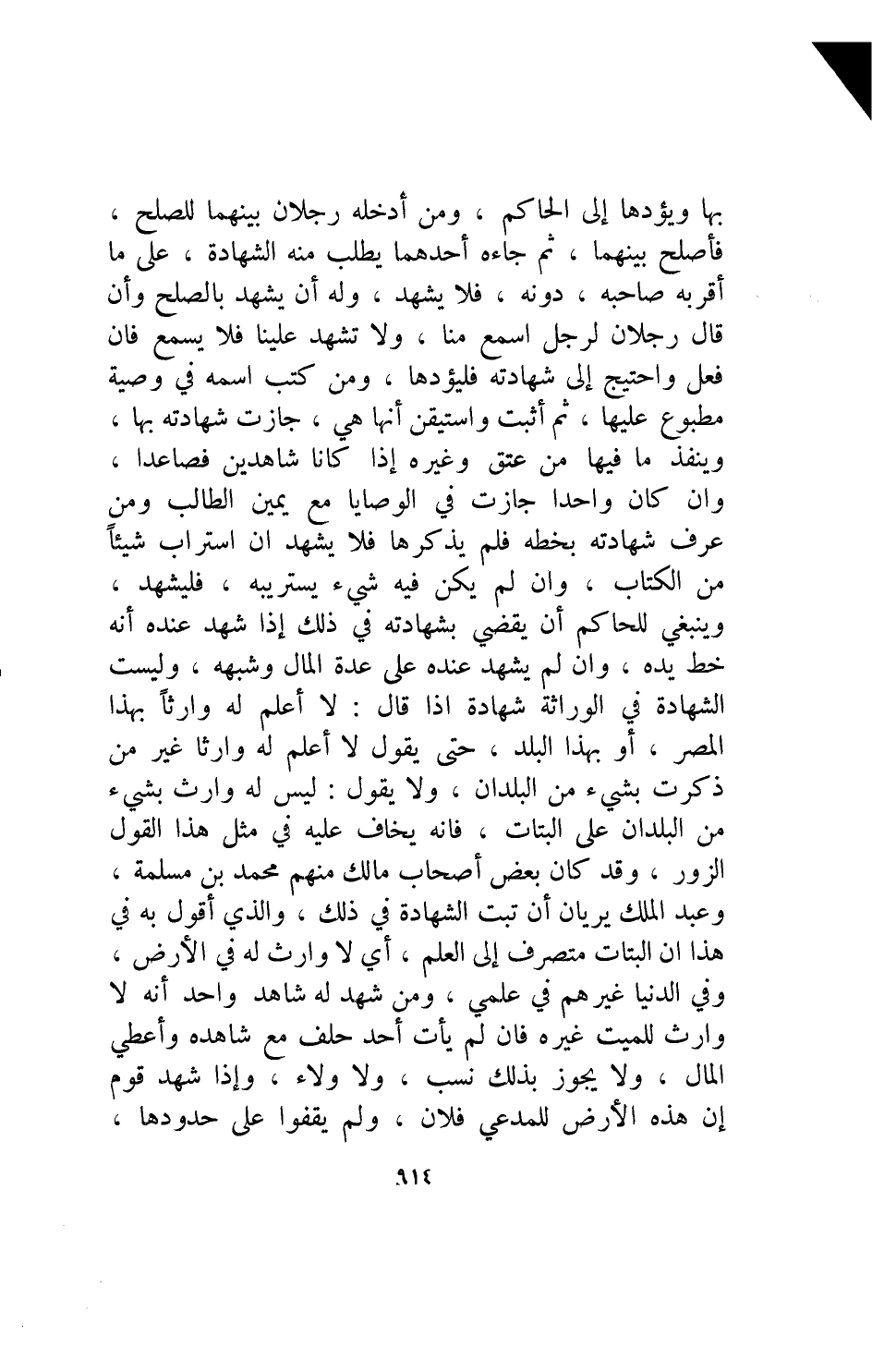 بها ويؤدها إلى الحاكم ومن أدخله ردلان بينهما للصلح فأصلح بينهما ثم جاءه أحدهما يطلب منه الشهادة على ما أقر به صاحبه دونه فلا يشهد وله أن يشهد بالصلح وأن قال رجلان اسمع منا ولا تشهد علينا فلا يسمع فإن فعل واحتيج إلى شهادته فليؤدها ومن كتب اسمه في وصية مطبوع عليها ثم أثبت واستيقن أنها هي جازت شهادته بها وينفذ ما فيها من عتق وغيره إذا كانا شاهدين فصاعدا وإن كان واحدا جازت في الوصايا مع يمين الطالب ومن عرف شهادته بخطه فلم يذكرها فلا يشهد إن استراب شيئا من الكتاب وأن لم يكن فيه شيء يستريبه فليشهد وينبغي للحاكم أن يقضي بشهادته في ذلك إذا شهد عنده أنه خط يده وأن لم يشهد عنده على عدة المال وشبهه وليست الشهادة في الوراثة شهادة إذا قال لا أعلم له وارثا بهذا المصر أو بهذا البلد حتى يقول لا أعلم له وارثا غير من ذكرت بشيء من البلدان ولا يقول ليس له وارث بشيء من البلدان على البتات فإنه يخاف عليه في مثل هذا القول الزور وقد كان بعض أصحاب الك منهم محمد بن مسلمة وعبد الملك يرويان أن تبت الشهادة في ذلك والذي أقول به في هذا أن البتات متصرف إلى العلم أي لا وارث له في الأرض وفي الدنيا غيرهم في علمي ومن شهد له شاهد واحد أنه لا وارث للمميت غيره فإن لم يأت أحد حلف مع شاهده وأعطي المال ولا يجوز بذلك نسب ولا ولاء وإذا شهد قوم إن هذه الأرض للمدعي فلان ولم يقفوا على حدودها
