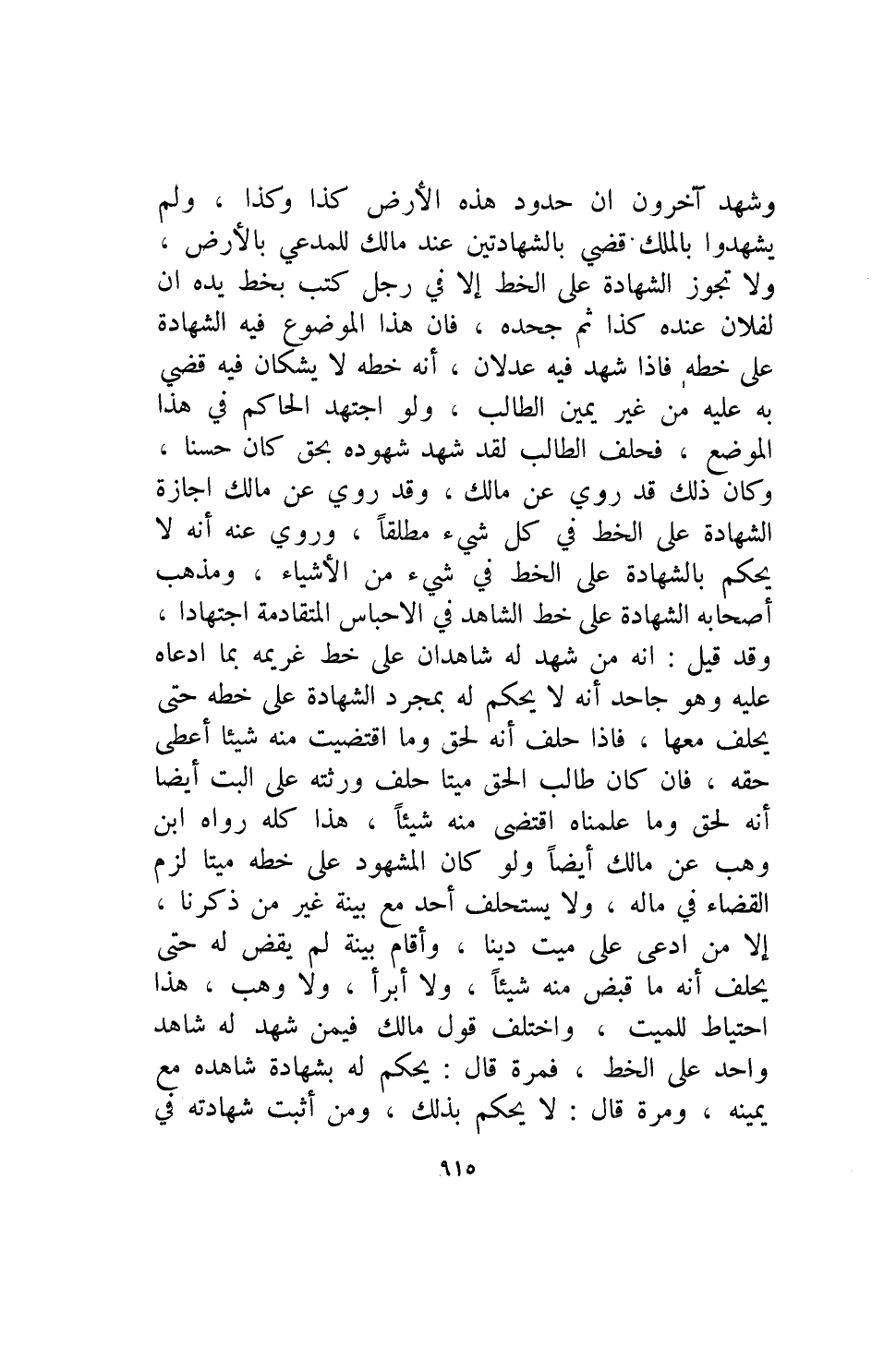 وشهد آخرون أن حدود هذه الأرض كذا وكذا ولم يشهدوا بالملك قضي بالشهادتين عند مالك للمدعي بالأرض ولا تجوز الشهادة على الخط إلا في رجل كتب بخط يده أن لفلان عنده كذا ثم جحده فإن هذا الموضوع فيه الشهادة على خطه فإذا شهد فيه عدلان أنه خطه لا يشكان يه قضي به عليه من غير يمين الطالب ولو اجتهد الحكم في هذا الموضع فحلف الطالب لقد شهد شهودده بحق كان حسنا وكان ذلك قد روي عن مالك وقد روي عن مالك إجازة الشهادة على الخط في كل شيء مطلقا وروي عنه أنه لا يحكم بالشهادة على الخط في شيء من الأشياء ومذهب أصابه الشهادة على خط الشاهد في الأحباس المتقادمة اجتهادا وقد قيل إنه من شهد له شاهدان على خط غريمه بما ادعاه عليه وهو جاحد أنه لا يحكم له بمجرد الشهادة على خطة حتى يحلف معها فإذا حلف أنه لق وما اقتضيت منه شيئا أعطي حقه فإن كان طالب الحق ميتا حلف ورثته على البت أيضا أنه لحق وما علمناه اقتضى منه شيئا هذا كله رواه ابن وهب عن مالك أيضا ولو كان المشهود على خطه ميتا لزم القضاء في ماله ولا يستحلف أحاد مع بينة غير من ذكرنا إلا من ادعى على ميت دينا وأقام بينة لم يقض له حتى يحلف أنه ما قبض منه شيئا ولا أبرأ ولا وهب هذا احتياط للميت واختلف قول مالك فيمن شهد له شاهد واحد على الخط فمرة قال يحكم له بشهادة شاهده مع يمينه ومرة قال لا يحكم بذلك ومن أثبت شهادته في