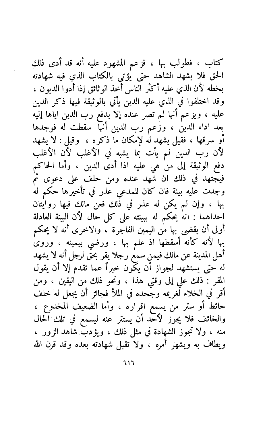 كتاب فطولب بها فزعم المشهود عليه أنه قد أدى ذلك الحق فلا يشهد الشاهد حتى يؤتى بالكتاب الذي فيه شهادته بخطه لأن الذي عليه أكثر الناس أخذ الوثائق إذا أدوا الديون وقد اختلفوا في الذي عليه الدين يأتي بالوثيقة فيها ذكر الدين عليه ويزعم أنها لم تصر عنده إلا بدفع رب الدين إياها إليه بعد أداء الدين وزعم رب الدين أنها سقطت له فوجدها أو سرقها فقيل يشهد له لإمكان ما ذكره وقيل لا يشهد لأن رب الدين لم يأت بما يشبه في الأغلب لأن الأغلب دفع الوثيقة إلى من هي عليه إذا أدى الدين وأما الحاكم فيجتهد في ذلك أن شهد عنده ومن حلف على دعوى ثم وجدت عليه بينة فإن كان للمدعي عذر في تأخيرها حكم له بها وإن لم يكن فه عذر في ذلك لعن مالك فيها روايتان إحداهما أنه يحكم له ببينته على كل حال لأن البينة العادلة أولى أن يقضى بها من اليمين الفاجرة والأخرى أنه لا يجحكم بها لأنه كأنه أسقطها إذ علم بها ورضي بيمينه وروى أهل المدينة عن مالك فيمن سمع رجلا يقر بحق لرجل أنه لا يشهد له حتى يستشهد لجوا أن يكون خبرا عما تقدم إلا أن يقول المقر ذلك علي إلى وقتي هذا ونحو ذلك من اليقين ومن أقر في الخلاء لغريمه وجحده فيالملأ فجائز أن يجعل له خلف حائط أو ستر من يسمع إقراره وأما الضعيف المخدوع والخائف فلا يجوز لأحد أن يستتر عنه ليسمع في تلك الحال منه ولا تجوز الشهادة في مثال ذلك ويؤدب شاهد الزور ويطاف به ويشهر أمره ولا تقبل شهادته بعده وقد قرن الله