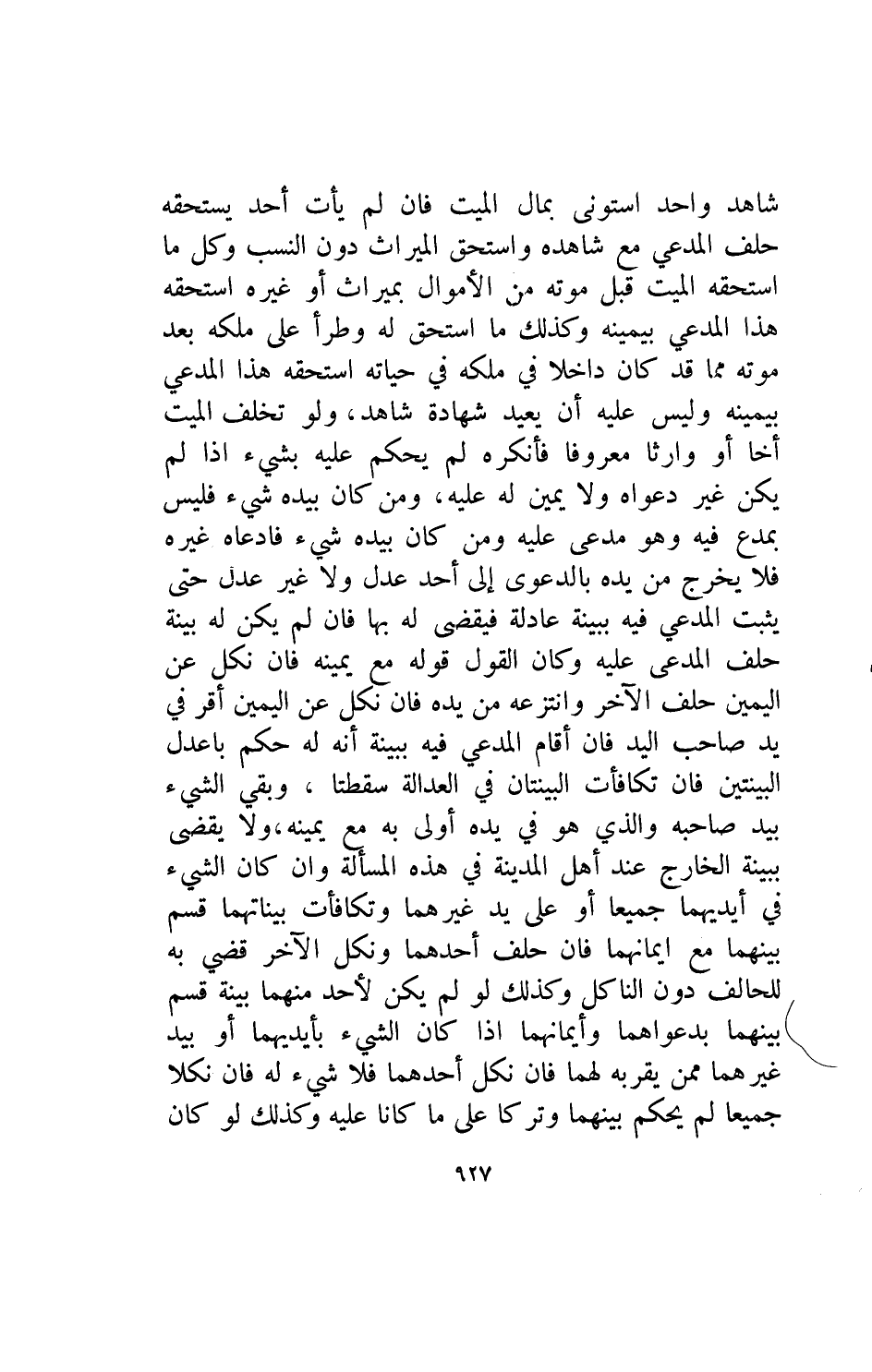 شاهد واحد استونى بمال الميت فإن لم يأت أحد يستحقه حلف المدعي مع شاهده واستحق الميراث دون النسب وكل ما استحقه الميت قبل موته من الأموال بميراث أو غيره استحقه هذا المدعي بيمينه وكذلك ما استحق له وطرأ على ملكه بعد موته مما قد كان داخلا في ملكه في حياته استحقه هذا المدعي بيمينه وليس عليه أن يعيد شهادة شاهد ولو تخلف الميت أخا أو وارثا معروفا فأنكره لم يحكم عليه بشيء إذا لم يكن غير دعواه ولا يمين له عليه ومن كان بيده شيء فليس بمدع فيه وهو مدعى عليه ومن كان بيده شيء فادعاه غيره فلا يخرج من يده بالدعوى إلى أحد عدل ولا غير عدل حتى يثبت المدعي فيه ببينة عادلة فيقضي له بها فإن لم يكن له بينة حلف المدعى عليه وكان القول قوله مع يمينه فإن نكل عن اليمين حلف الآخر وانتزعه من يده فإن نكل عن اليمين أقر في يد صاحب اليد فإن أقام المدعي فيه ببينة أنه له حكم باعدل البينتين فإن تكافأت البينتان في العدالة سقطتا وبقي الشيء بيد صاحبه والذي هو في يده أولى به مع يمينه ولا يقضي ببينة الخارج عند أهل المدينة في هذه المسألة وان كان الشيء في أيديهما جميعا أو على يد غيرهما وتكافأت بيناتهما قسم بينهما مع ايمانها فإن حلف أحدهما ونكل الآخر قضي به للحالف دون الناكل وكذلك لو لم يكن لأحد منهما بينة قسم بينهما بدعواهما وأيمانهما إذا كان الشيء بأيديهما أو بيد غيرهما ممن يقربه لهما فإن نكل أحدهما فلا شيء له فإن نكلا جميعا لم يحكم بينهما وتركا على ما كانا عليه وكذلك لو كان