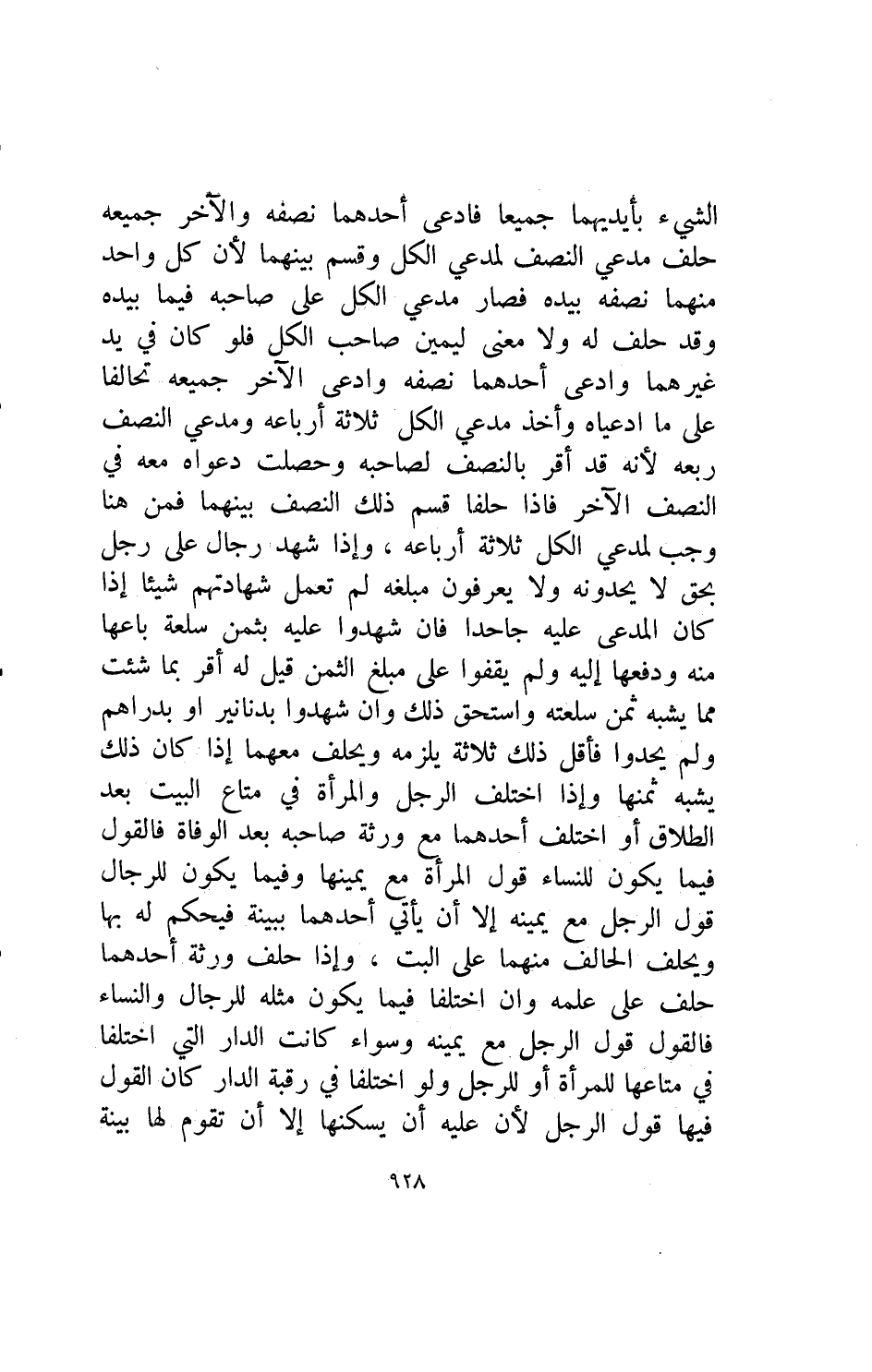 الشيء بأيديهما جميعا فادعى أحدهما نصفه والآخر جميعه حلف مدعي النصف لمدعي الكل وقسم بينهما لأن كل واحد منهما نصفه بيده فصار مدعي الكل على صاحبه فيما بيده وقد حلف له ولا معنى ليمين صاحب الكل فلو كان في يد غيرهما وادعى أحدهما نصفه وادعى الآخر جميعه تحالفا على ما ادعياه وأخذ مدعي الكل ثلاثة أرباعه ومدعي النصف ربعه لأنه قد أقر بالنصف لصاحبه وحصلت دعواه معه في النصف الآخر فإذا حلفا قسم ذلك النصف بينهما فمن هنا وجب لمدعي الكل ثلاثة أرباعه وإذا شهد رجال على رجل بحق لا يحدونه ولا يعرفون مبلغه لم تعمل شهادتهم شيئا إذا كان المدعي عليه جاحدا فإن شهدوا عليه بثمن سلعة باعها منه ودفعها إليه ولم يقفوا على مبلغ الثمن قيل له أقر بما شئت مما يشبه ثمن سلعته واستحق ذلك وان شهدوا بدنانير أو بدراهم ولم يحدوا فأقل ذلك ثلاثة يلزمه ويحلف معهما إذا كان ذلك يشبه ثمنها وإذا اختلف الرجل والمرأة في متاع البيت بعد الطلاق أو اختلف أحدهما مع ورثة صاحبه بعد الوفاة فالقول فيما يكون للنساء قول المرأة مع يمينها وفيما يكون للرجال قول الرجل مع يمينه إلا أن يأتي أحدهما ببينة فيحكم له بها ويحلف الحالف منهما على البت وإذا حلف ورثة أحدهما حلف على علمه وان اختلفا فيما يكون مثله للرجال والنساء فالقول قول الرجل مع يمينه وسواء كانت الدار التي اختلفا في متاعها للمرأة أو للرجل ولو اختلفا في رقبة الدار كان القول فيها قول الرجل لأن عليه أن يسكنها إلا أن تقوم لها بينه