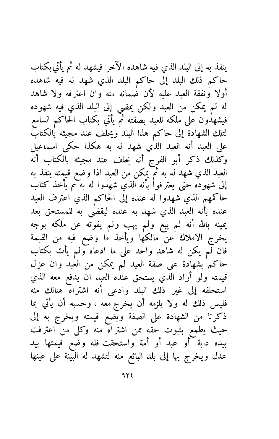 ينفذ به الى البلد الذي فيه شاهده الاخر فيشهد له ثم يأتي بكتاب حاكم ذلك البلد الى حاكم البلد الذي شهد له فيه شاهده أولا ونفقة العبد عليه لأن ضمانه منه وان اعترفه ولا شاهد له لم يمكن من العبد ولكن يمضي الى البلد الذي فيه شهوده فيشهدون على ملكه للعبد بصفته ثم يأتي بكتاب الحاكم السامع لتلك الشهاده الى حاكم هذا البلد ويحلف عند مجيئه بالكتاب على العبد انه العبد الذي شهد له به هكذا حكى اسماعيل وكذلك ذكر ابو الفرج أنه يحلف عند مجيئه بالكتاب أنه العبد الذي شهد له به ثم يمكن من العبد اذا وضع قيمته ينفذ به الى شهوده حتى يعترفوا بأنه الذي شهدوا له به بم يأخذ كتاب حاكمهم الذي شهدوا له عنده الى الحاكم الذي اعترف العبد عنده بأنه العبد الذي شهد به عنده ليقضي به للمستحق بعد يمينه بالله انه لم يبع ولم يهب ولم يفوته عن ملكه بوجه يخرج الاملاك عن مالكها ويأخذ ما وضع فيه من القيمه فإن لم يكن له شاهد واحد على ما ادعاه ولم يأت بكتاب حاكم بشهادة على صفة العبد لم يمكن من العبد وان عزل قيمته ولو اراد الذي يستحق عنده العبد ان يدفع معه الذي استحلفه الى غير ذلك البلد وادعى أنه اشتراه هنالك منه فليس ذلك له ولا يلزمه أن يخرج معه وحسبه أن يأتي بما ذكرنا من الشهادة على الصفة ويضع قيمته ويخرج به الى حيث يطمع بثبوت حقه ممن اشتراه منه وكل من اعترفت بيده دابة أو عبد أو امه واستحقت فله وضع قيمتها بيد عدل ويخرج بها الى بلد البائع منه لتشهد له البينه على عينها