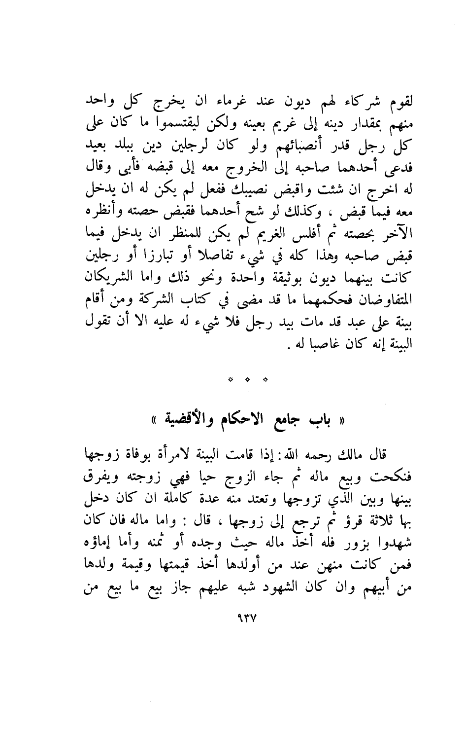 لقوم شركاء لهم ديون عند غرماء أن يخرج كل واحد منهم بمقدار دينه الى غريم بعينه ولكن ليقتسموا ما كان على كل رجل قدر انصبائهم ولو كان لرجلين دين ببلد بعيد فدعى احدهما صاحبه الى الخروج معه الى قبضه فأبى وقال له اخرج ان شئت واقبض نصيبك ففعل لم يكن له ان يدخل معه فيما قبض وكذلك لو شح احدهما فقبض حصته وانظره الاخر بحصته ثم افلس الغريم لم يكن للمنظر ان يدخل فيما قبض صاحبه وهذا كله في شيء تفاصلا او تبارزا أو رجلين كانت بينهما ديون بوثيقة واحده ونحوذلك وأما الشريكان المتفاوضان فحكمهما ما قد مضى في كتاب الشركه ومن اقام بينة على عبد قد مات بيد رجل فلا شيء له عليه إلا أن تقول البينة إنه كان غاصبا له