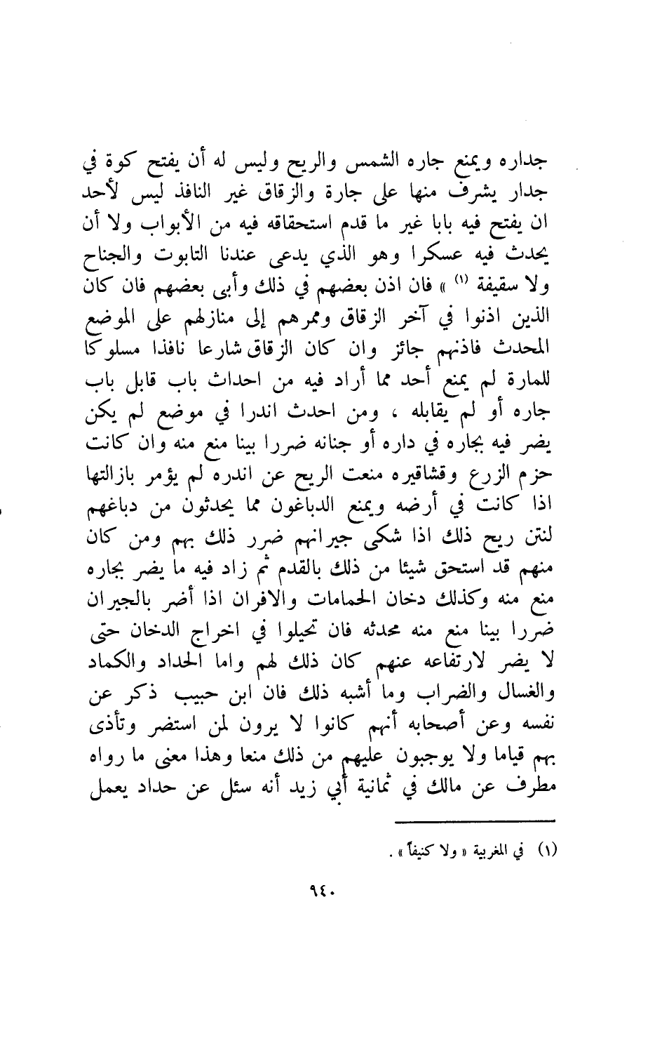 جداره ويمنع جاره الشمس والريح وليس له أن يفتح كوة في جدار يشرف منها على جاره والزقاق غير النافذ ليس لأحد أن يفتح فيه بابا غير ما قدم استحقاقه فيه من الابواب ولا أن يحدث فيه عسكرا وهو الذي يدعي عندنا التابوت والجناح ولا سقيفه فإن اذن بعضهم في ذلك وأبى بعضهم فإن كان الذين اذنوا في اخر الزقاق وممرهم الى منازلهم على الموضع المحدث فإذنهم جائز وان كان الزقاق شارعا نافذ مسلوكا للمارة لم يمنع أحد مما أراد فيه من احداث باب قابل باب جاره أو لم يقابله ومن احدث اندرا في موضع لم يكن يضر فيه بجاره في داره أو جنانه ضررا بينا منع منه وان كانت حزم الزرع وقشاقيره منعت الريح عن اندره لم يؤمر بازالتها إذا كانت في ارضه ويمنع الدباغون مما يحدثون من دباغهم لنتن ريح ذلك إذا شكى جيرانهم ضرر ذلك بهم ومن كان منهم قد استحق شيئا من ذلك بالقدم ثم زاد فيه ما يضر بجاره منع منه وكذلك دخان الحمامات والافران اذا أضر بالجيران ضررا بينا منع منه محدثه فإن تحيلوا في اخراج الدخان حتى لا يضر لارتفاعه عنهم كان ذلك لهم واما الحداد والكماد والعسال والضراب وما اشبه ذلك فإن ابن حبيب ذكر عن نفسه وعن اصحابه انهم كانوا لا يرون لمن استضر وتأذى بهم قياما ولا يوجبون عليهم من ذلك منعا وهذا معنى رواه مطرف عن مالك في ثمانية ابي زيد أنه سئل عن حداد يعمل
