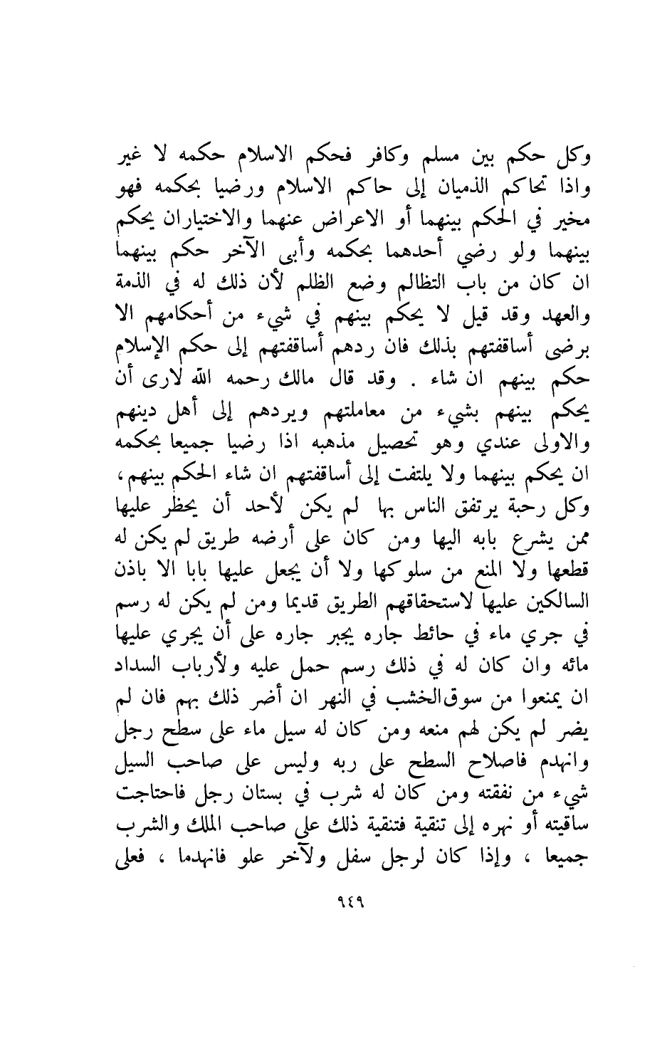 وكل حكم بين مسلم وكافر فحكم الإسلام حكمه لا غير وإذا تحاكم الذميان الى حاكم الإسلام ورضيا بحكمه فهو مخير في الحكم بينهما أو الإعراض عنهما والاختياران يحكم بينهما ولو رضي احدهما بحكمه وأبى الاخر حكم بينهما ان كان من باب التظالم وضع الظلم لأن ذلك له في الذمة والعهد وقد قيل لا يحكم بينهم في شيء من احكامهم الا برضى أساقفتهم بذلك فإن ردهم اساقفتهم الى حكم الاسلام حكم بينهم ان شاء وقد قال مالك رحمه الله لأرى أن يحكم بينهم بشيء من معاملتهم ويردهم الى اهل دينهم والاولى عندي وهو تحصيل مذهبه اذا رضيا جميعا بحكمه أن يحكم بينهما ولا يلتفت الى اساقفتهم إن شاء الحكم بينهم وكل رحبة يرتفق الناس بها لم يكن لاحد ان يحظر عليها ممن يشرع بابه اليها ومن كان على ارضه طريق لم يكن له قطعها ولا المنع من سلوكها ولا أن يجعل عليها بابا إلا بإذن السالكين عليها لاستحقاقهم الطريق قديما ومن لم يكن له رسم في جري ماء في حائط جاره يجبر جاره على أن يجري عليها مائة وان كان له في ذلك رسم حمل عليه ولأرباب السداد أن يمنعوا من سوق الخشب في النهر ان أضر ذلك بهم فإن لم يضر لم يكن لهم منعه ومن كان له سيل ماء على سطح جل وانهدم فاصلاح السطح على ربه وليس على صاحب السيل شيء من نفقته ومن كان له شرب في بستان رجل فاحتاجت ساقيته أو نهره الى تنقية فتنقية ذلك على صاحب الملك والشرب جميعا واذا كان لرجل سفل ولاخر علو فانهدما فعلى