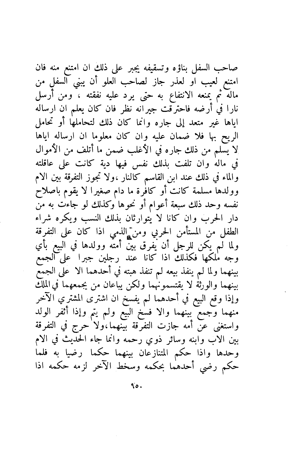 صاحب السفل بناؤه وتسقيفه يجبر على ذلك ان امتنع منه فإن امتنع لعيب او لعذر جاز لصاحب العلو أن يبني السفل من ماله ثم يمنعه الانتفاع به حتى يرد عليه نفقته ومن أرسل نارا في ارضه فاحترقت جيرانه نظر فإن كان يعلم أن ارساله اياها غير متعد الى جاره وانما كان ذلك لتحاملها أو تحامل الريح بها فلا ضمان عليه وان كان معلوما ان ارساله اياها لا يسلم من ذلك جاره في الاغلب ضمن ما اتلف من الاموال في ماله وان تلفت بذلك نفس فيها دية كانت على عاقلته والماء في ذلك عند ابن القاسم كالنار ولا تجوز التفرقه بين الام وولدها مسلمة كانت أو كافرة ما دام صغيرا لا يقوم باصلاح نفسه وحد ذلك سبعة أعوام او نحوها وكذلك لو جاءت به من دار الحرب وان كانا لا يتوارثان بذلك النسب ويكره شراء الطفل من المستأمن الحربي ومن الذمي اذا كان على التفرقه ولما لم يكن للرجل ان فرق بين أمته وولدها في البيع بأي وجه ملكها فكذلك إذا كانا عند رجلين جبرا على الجمع بينهما ولما لم ينفذ بيعه لم تنفذ هبته في احدهما الا على الجمع بينهما والورثة لا يقتسمونها ولكن يباعان من يجمعهما في الملك واذا وقع البيع في حدهما لم يفسخ ان اشترى المشتري الاخر منهما وجمع بينهما والا فسخ البيع ولم يتم وإذا أثفر الولد واستغنى عن أمه جازت التفرقة بينهما ولا حرج في التفرقة بين الاب وابنه وسائر ذوى رحمه وانما جاء الحديث في الام وحدها واذا حكم المتنازعان بينهما حكما رضيا به فلما حكم رضي احدهما بحكمه وسخط الاخر لزمه حكمه اذا