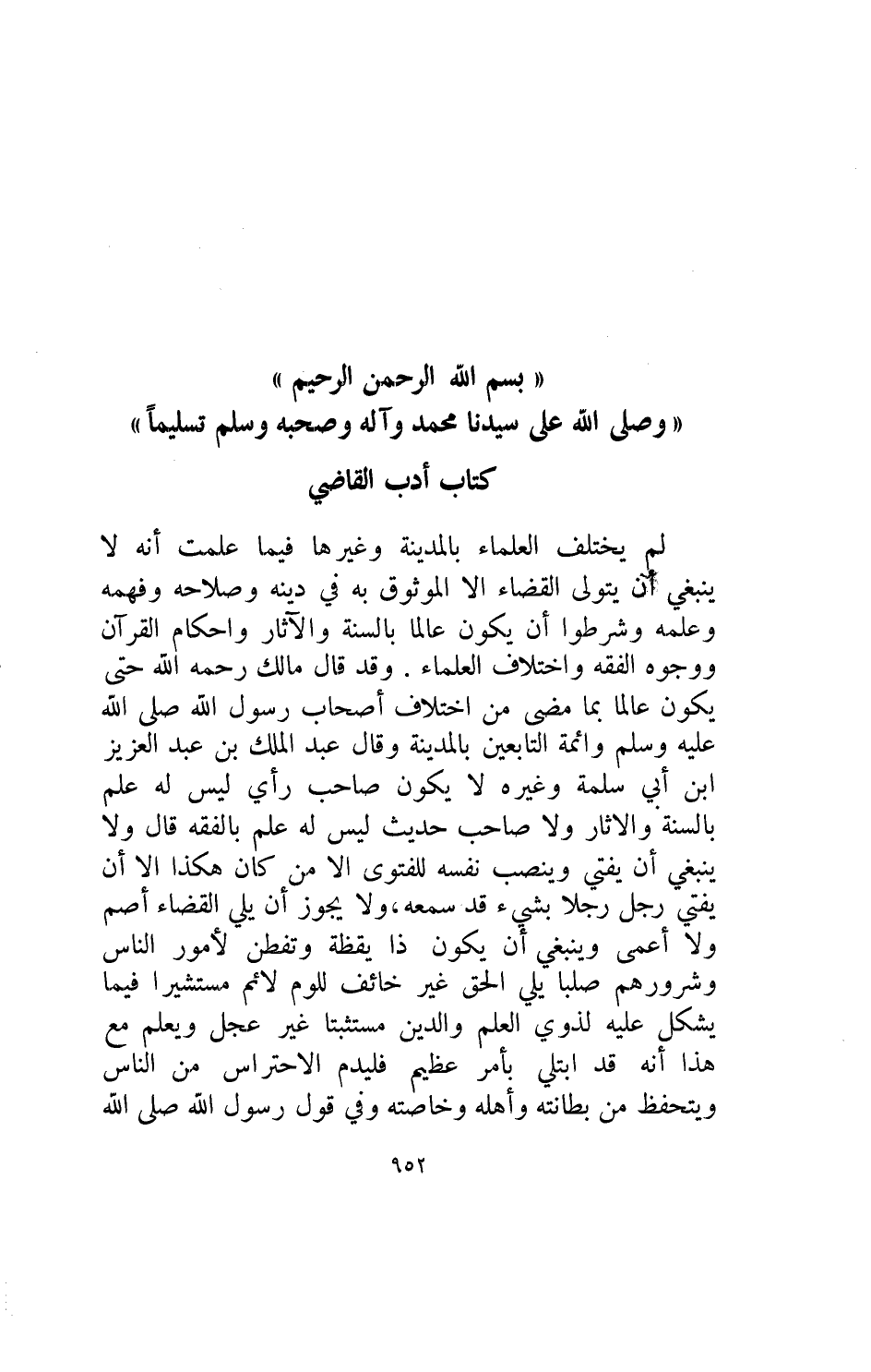 لم يختلف العلماء بالمدينة وغيرها فيما علمت أنه لا ينبغي أن يتولى القضاء إلا الموثوق به في دينه وصلاحه وفهمه وعلمه وشرطوا أن يكون عالما بالسنة والآثار وأحكام القرآن ووجوه الفقه واختلاف العلماء وقد قال مالك رحمه الله حتى يكون عالما بما مضى من اختلاف أصحاب رسول الله صلى الله عليه وسلم وأئمة التابعين بالمدينة وقال عبد الملك بن عبد العزيز بن أبي سلمة وغيره لا يكون صاحب رأي ليس له علم بالسنة والآثار ولا صاحب حديث ليس له علم بالفقه قال ولا ينبغي أن يفتي وينصب نفسه للفتوى إلا من كان هكذا إلا أن يفتي رجل رجلا بشيء قد سمعه ولا يجوز أن يلي القضاء أصم ولا أعمى وينبغي أن يكون ذا يقظة وتفطن لأمور الناس وشرورهم صلبا يلي الحق غير خائف للوم لائم مستشيرا فيما يشكل عليه لذوي العلم والدين مستثبتا غير عجل ويعلم مع هذا أنه قد ابتلى بأمر عظيم فليدم الاحتراس من الناس ويتحفظ من بطانته وأهله وخاصته وفي قول رسول الله صلى الله